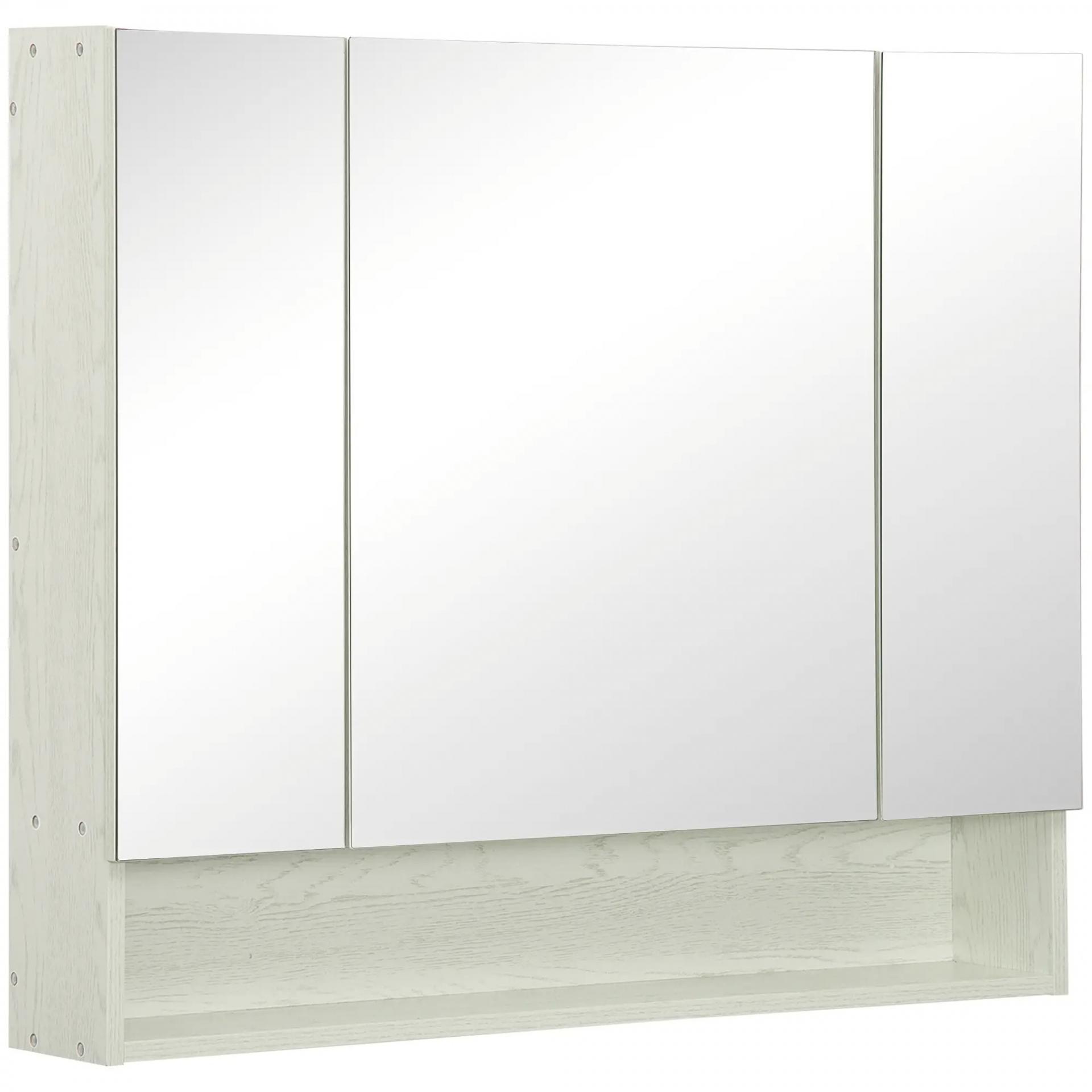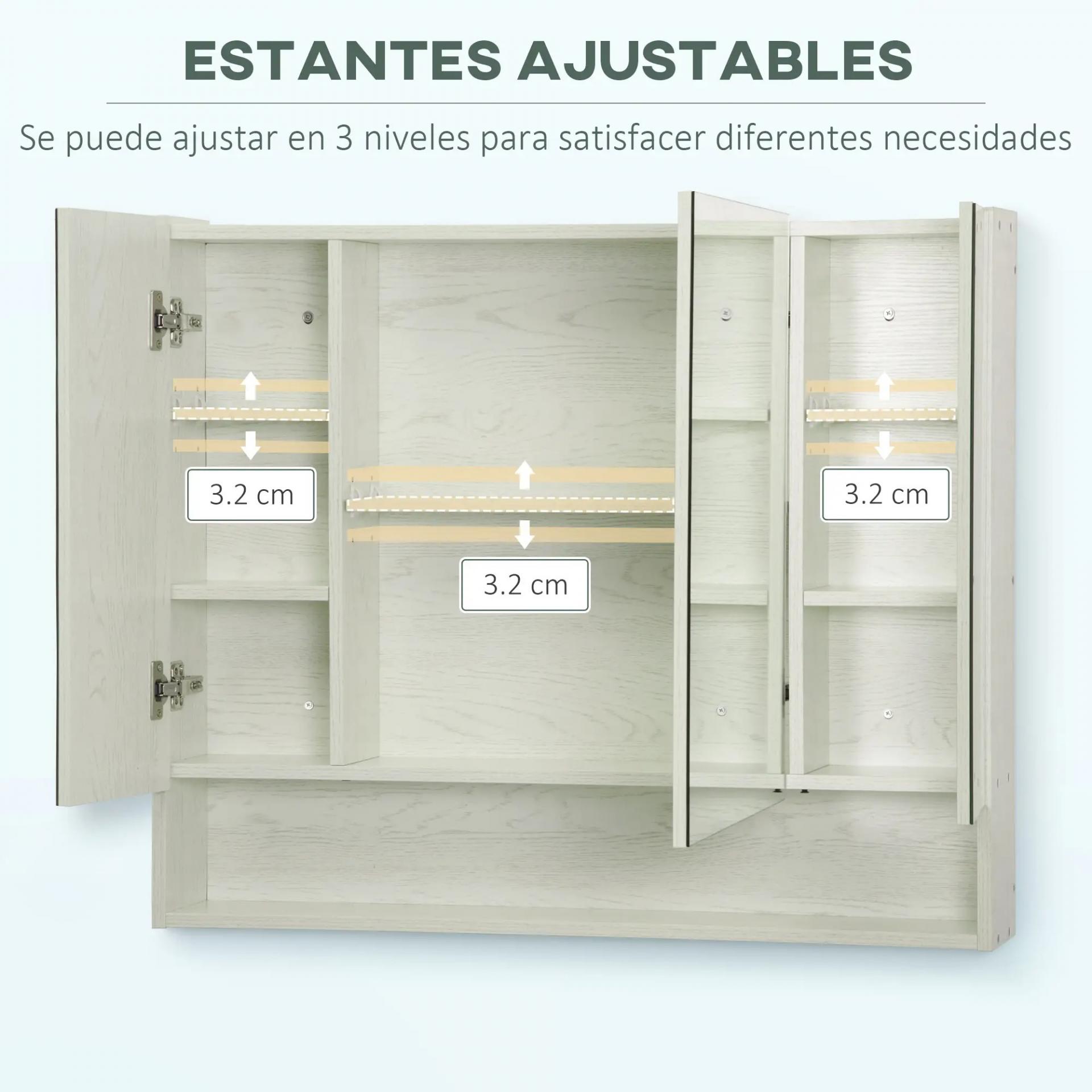 - EXCELENTE FUNCIONALIDAD: Ideal para el uso diario, este armario de baño cuenta con tres puertas espejadas, perfectas para tu rutina matutina. Dispone de tres compartimentos internos con estantes ajustables y un estante externo, ofreciendo amplio almacenamiento