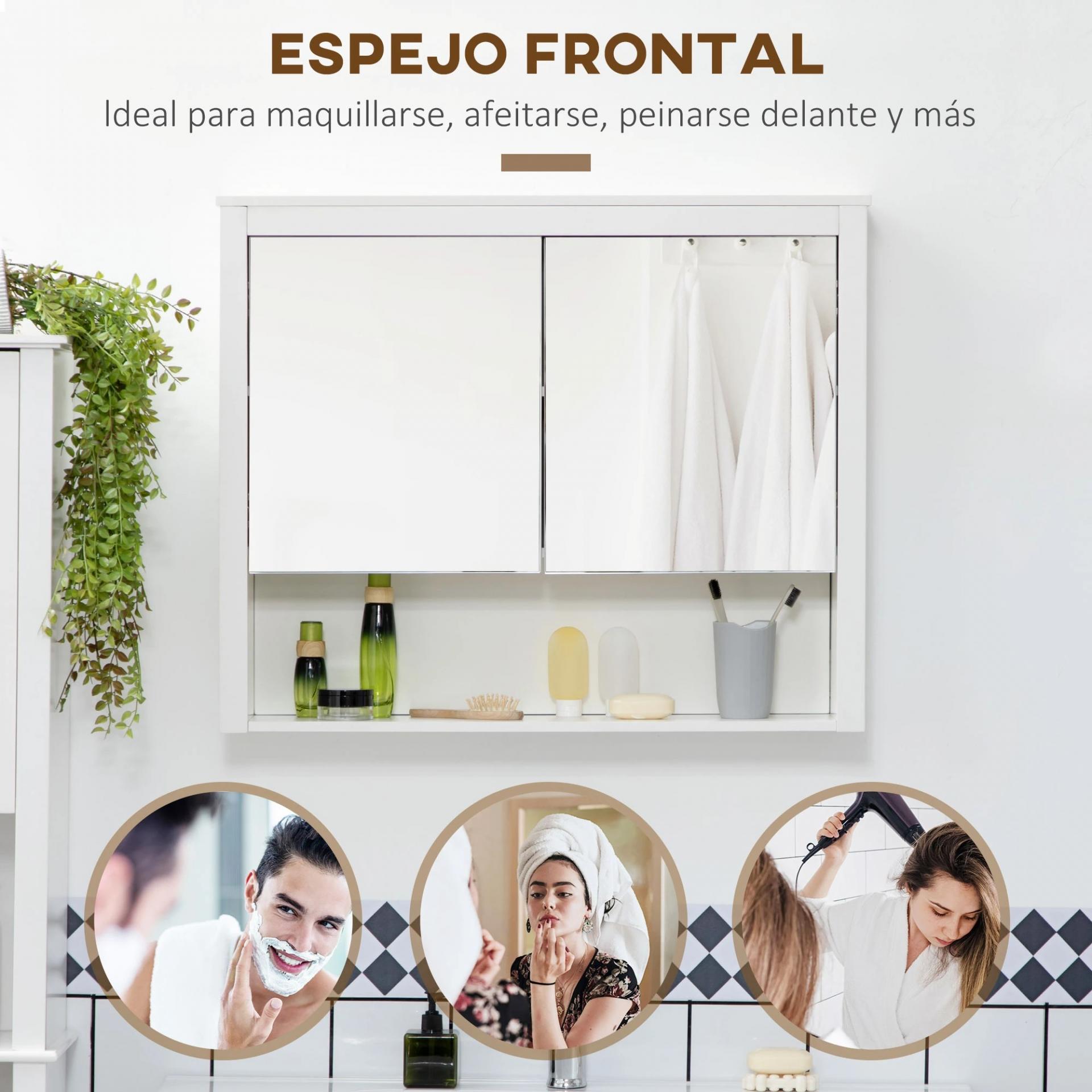 ARMARIO ESPEJO 2 EN 1: Este mueble de pared para baño tiene un diseño 2 en 1. Tiene dos puertas de espejo en la parte exterior, convenientes para maquillarse o afeitarse. Y en el interior hay 2 estantes adecuados para guardar tus productos de higiene personal, cremas, perfumes, entre otros