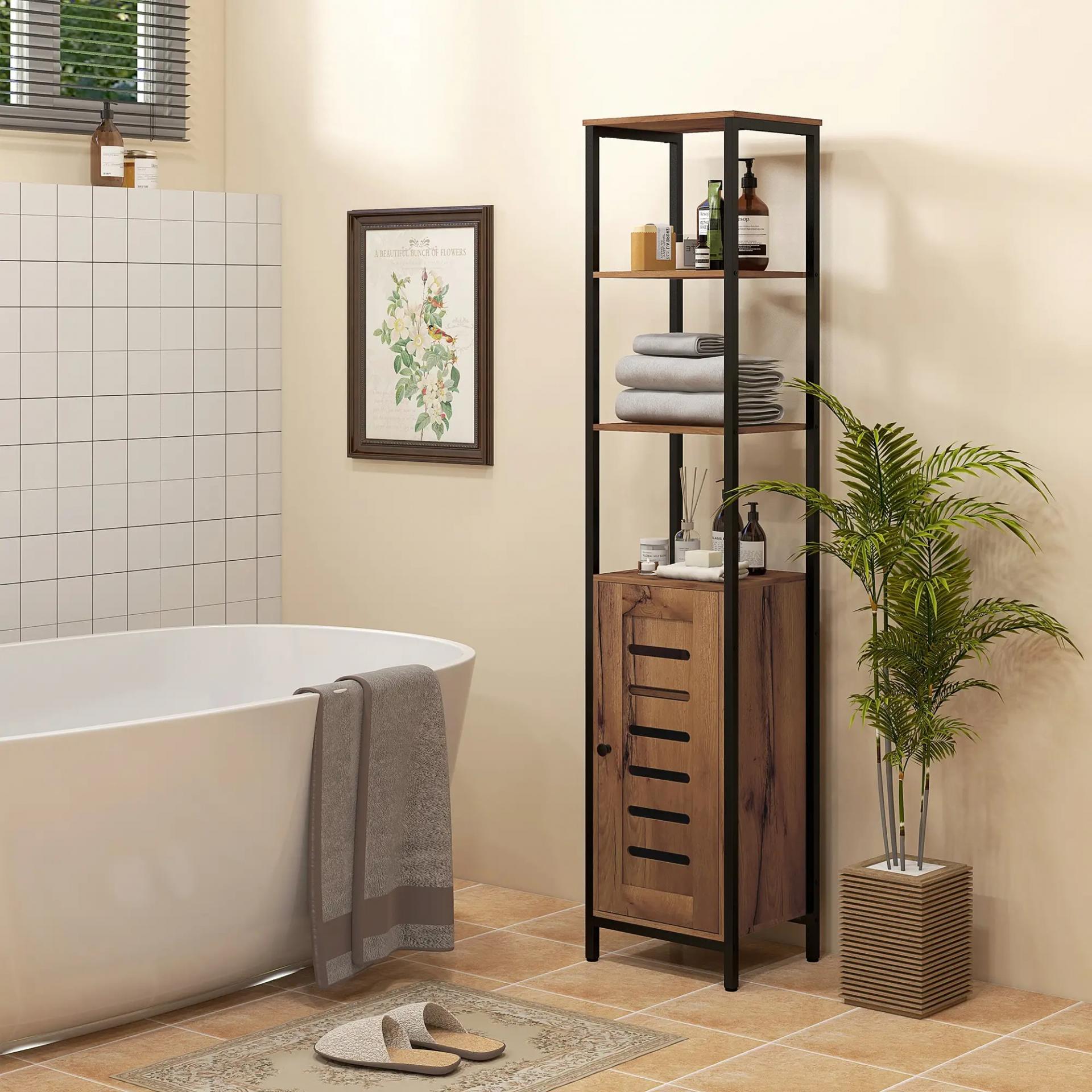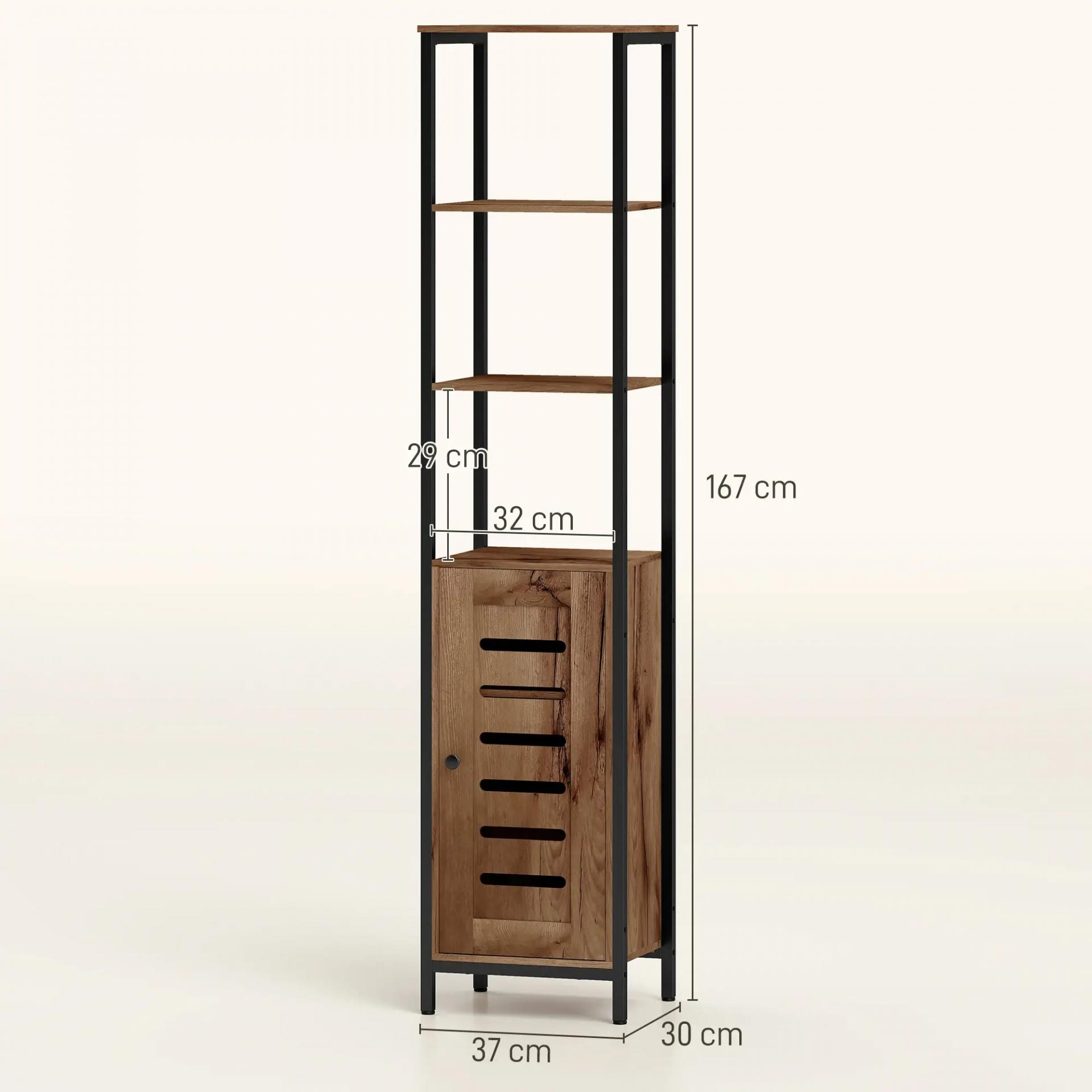 Columna de Baño Estrecha con Puerta de Lamas Estantes Ajustables Compartimentos Abiertos 37x30x167 cm Marrón Rústico