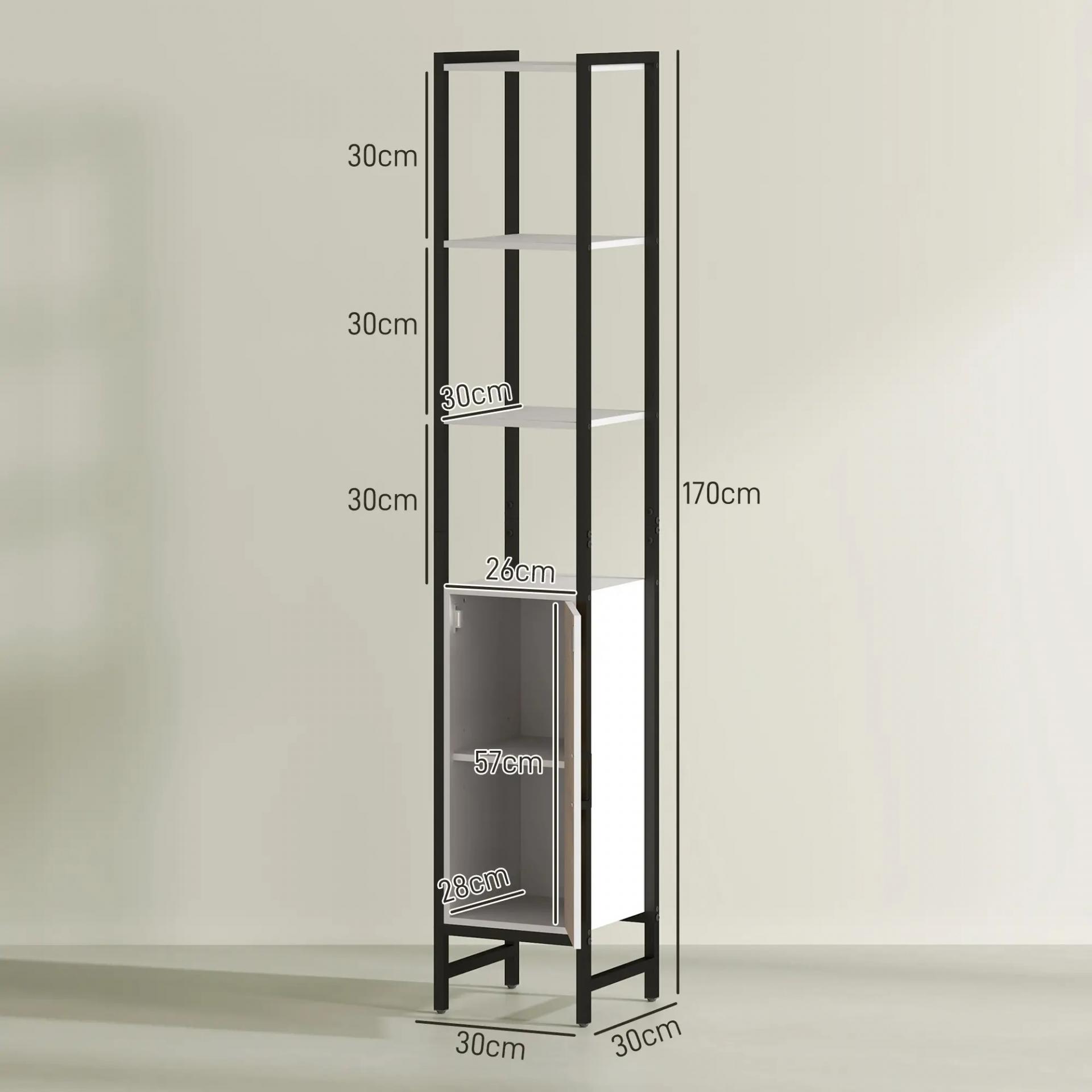 Armario Alto de Baño con 3 Estantes Abiertos 1 Puerta y Estante Ajustable Anti-vuelco 30x30x170 cm Blanco y Nogal