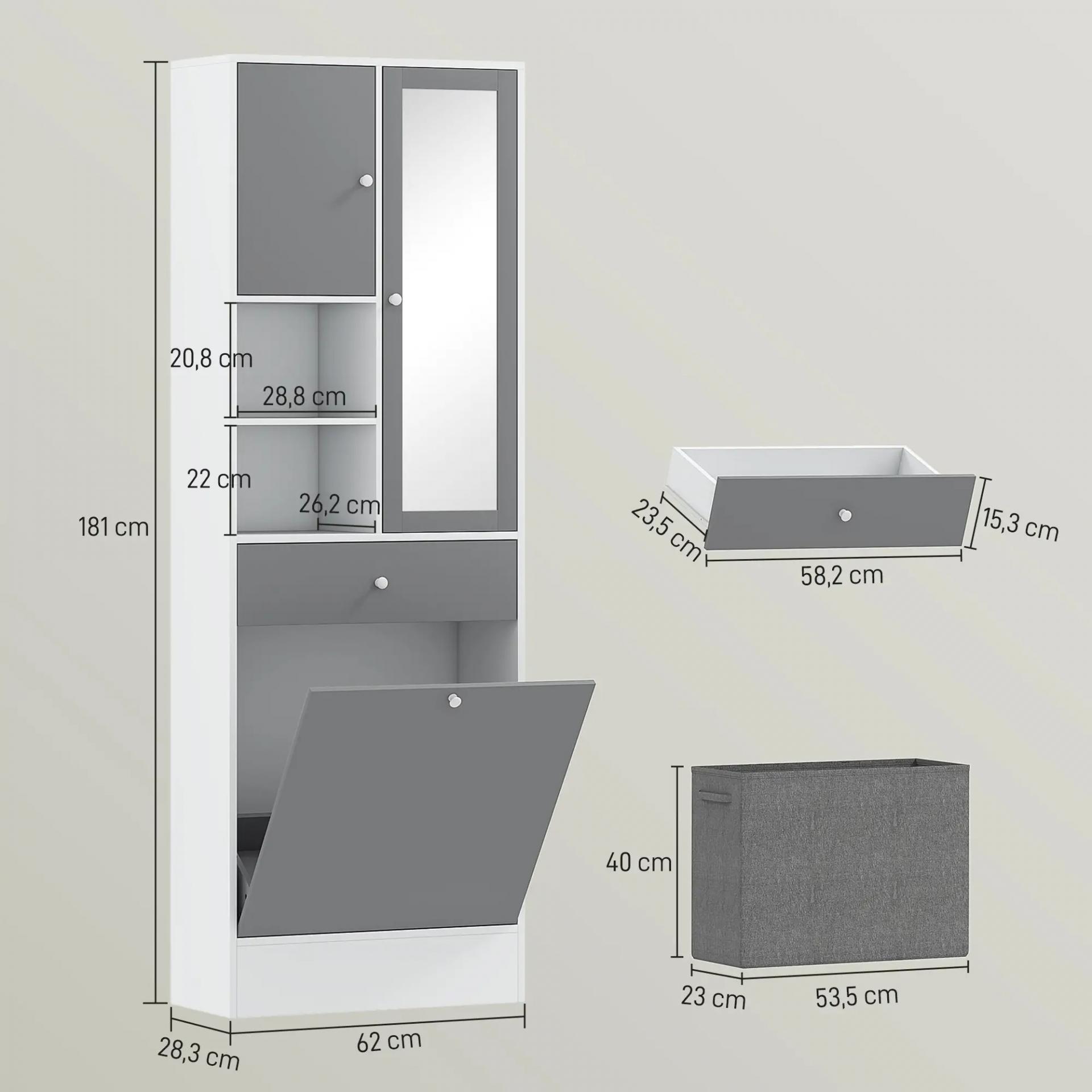 Armario de Baño con Cesto Ropa Sucia Espejo Cajón Compartimentos y Estantes Ajustables 62x28,3x181 cm Blanco y Gris