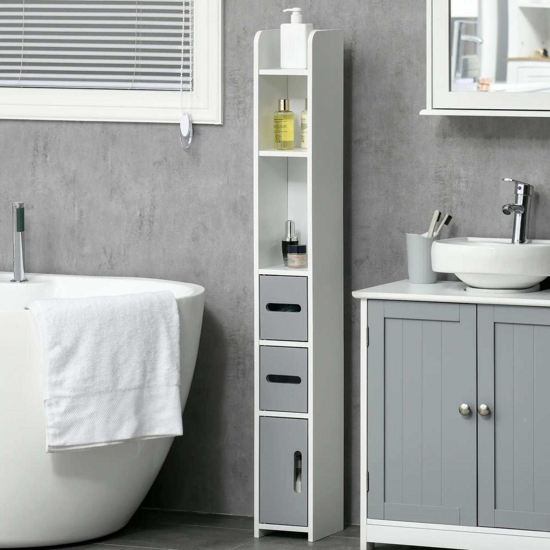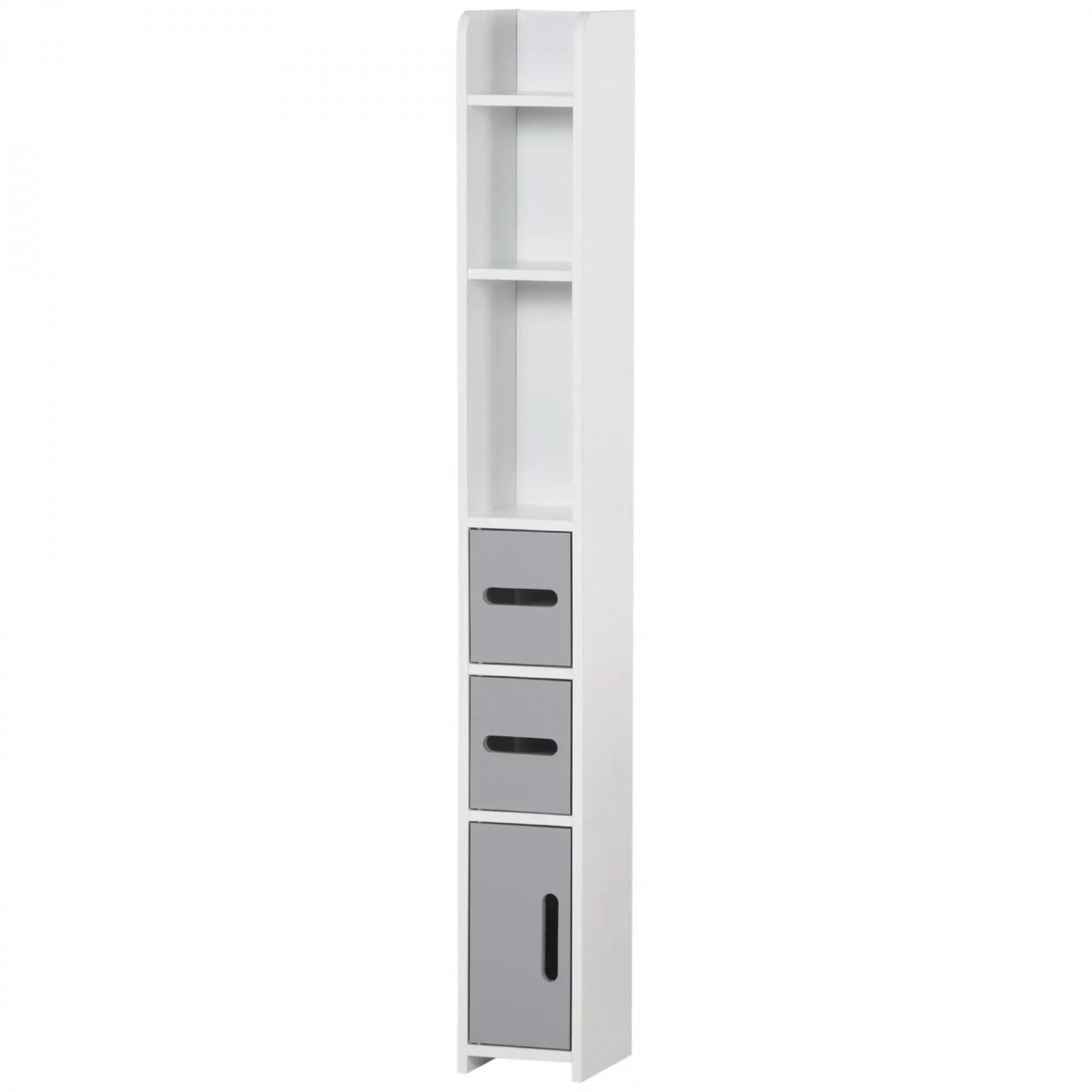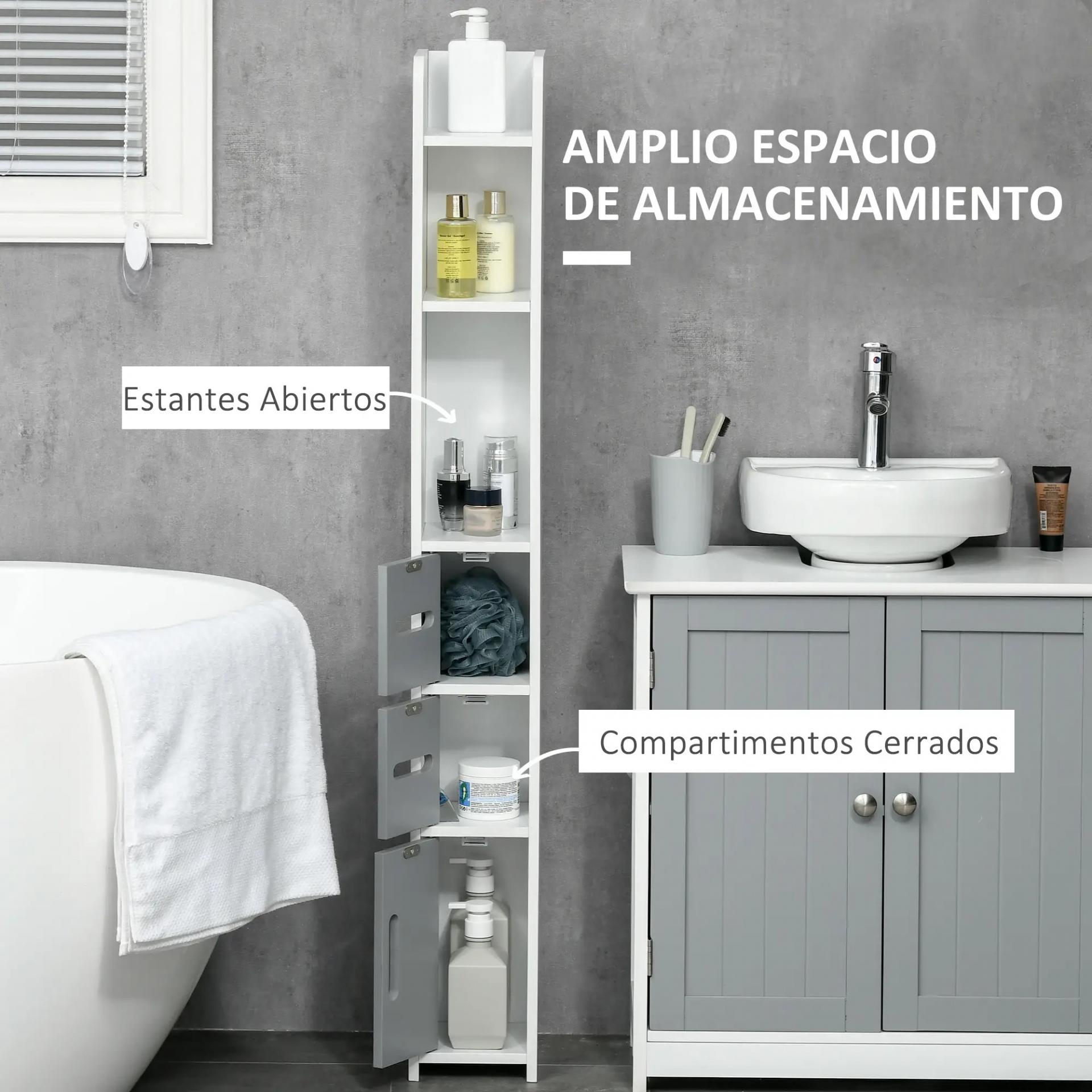 Columna Baño con 3 Puertas y 3 Estantes Mueble Auxiliar Alto de Estilo Moderno 15x17x120cm Blanco y Gris