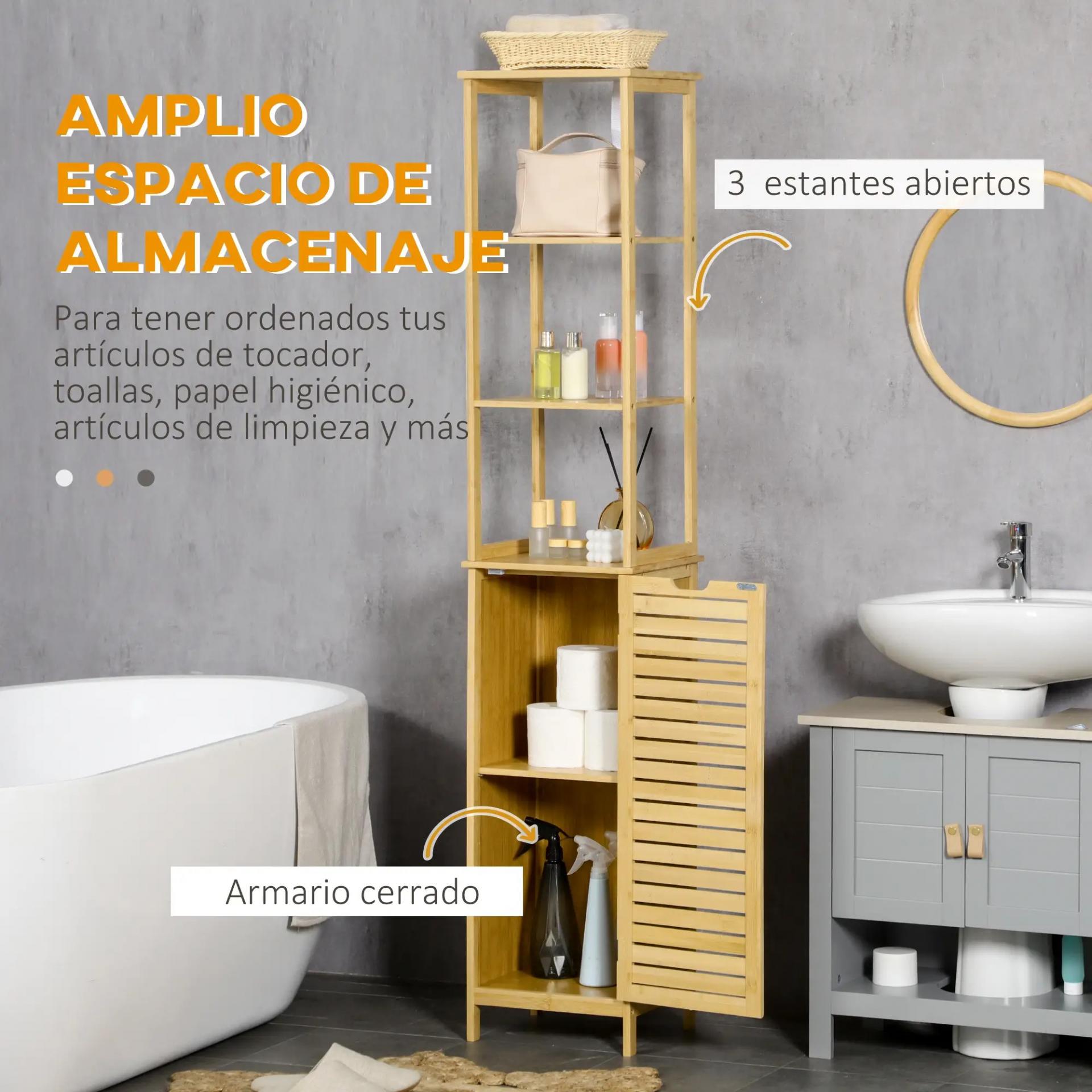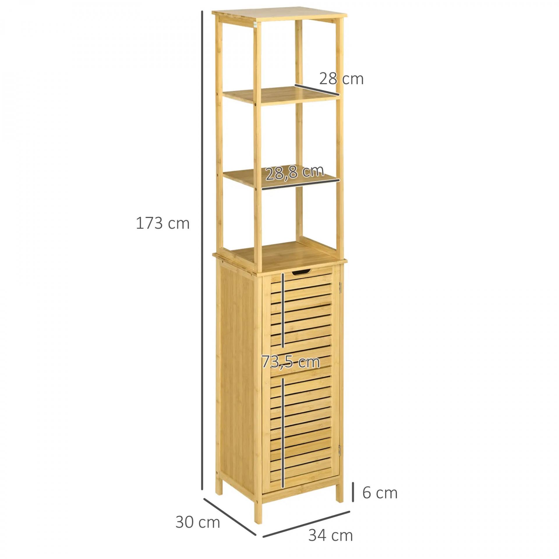 Estantería de Baño de Bambú Armario Alto para Baño con 3 Estantes y 1 Puerta Mueble Columna de Almacenaje 34x30x173 cm Natural