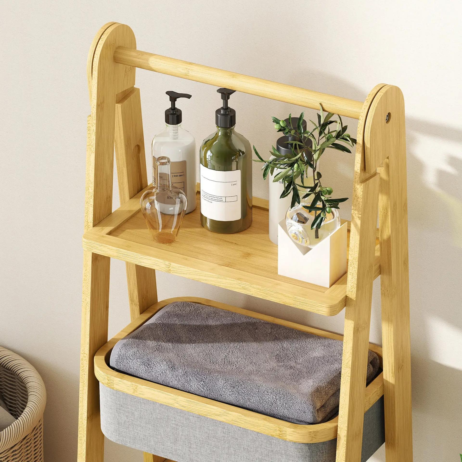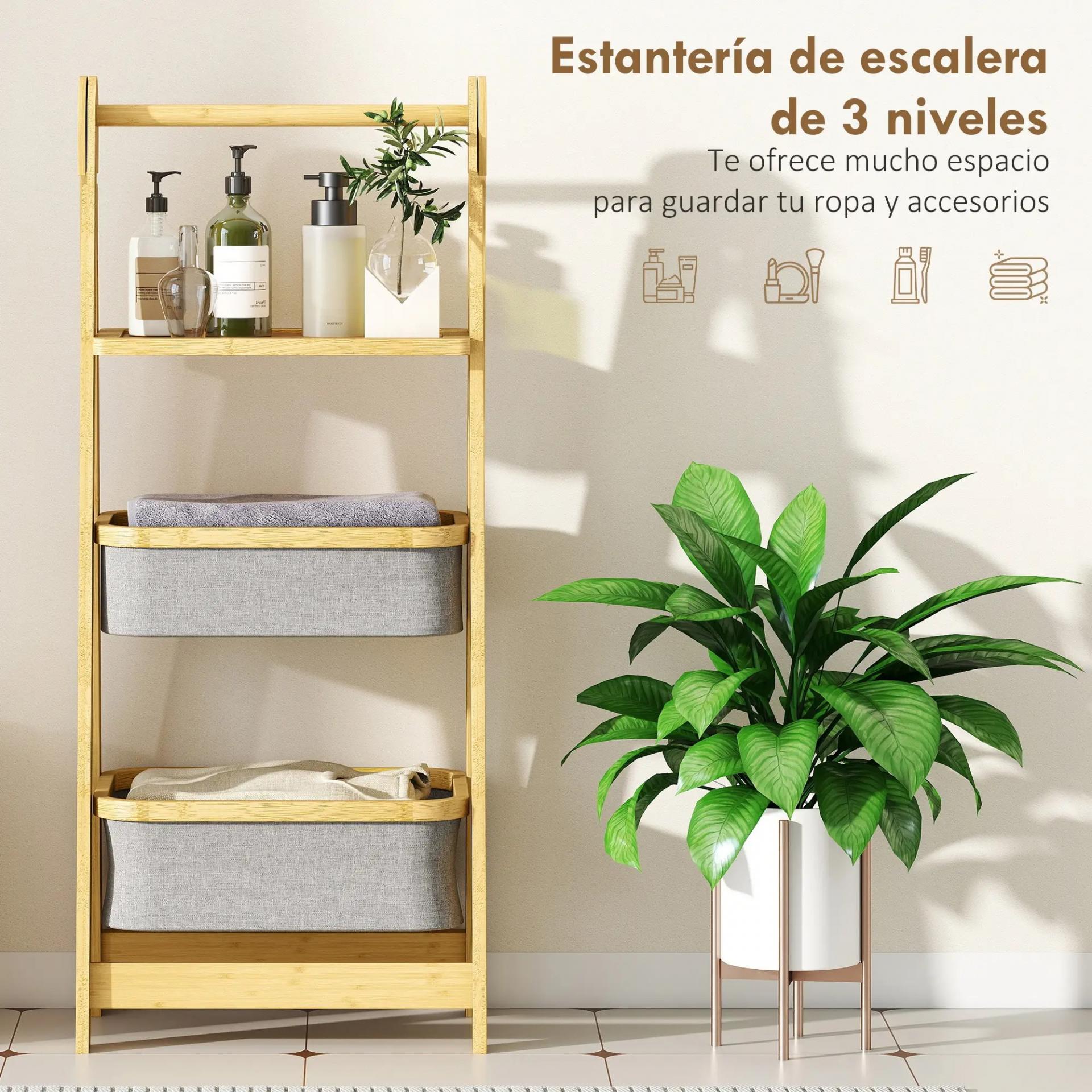 - MATERIAL NATURAL DE BAMBÚ: Esta estantería para baño está fabricada en bambú y combinada con tejido tipo lino, lo que aporta resistencia, durabilidad y un acabado elegante