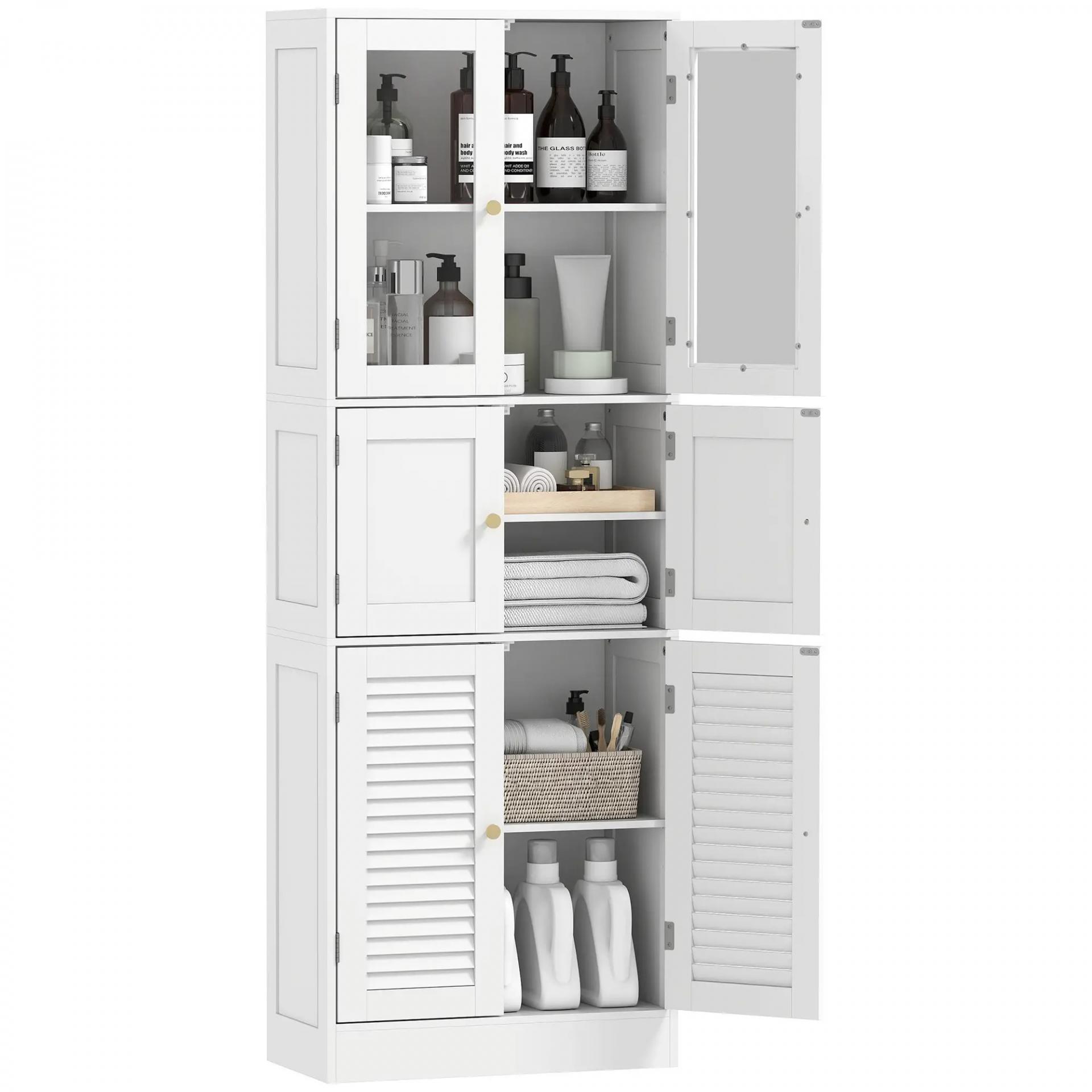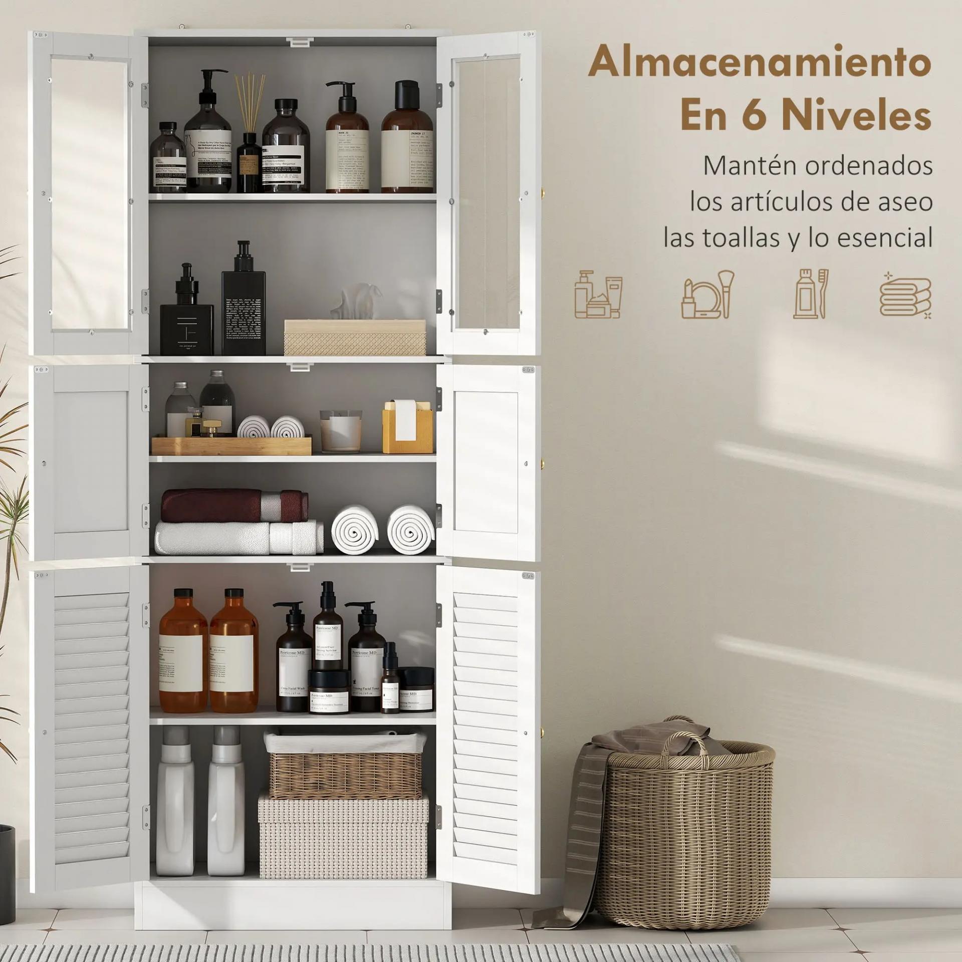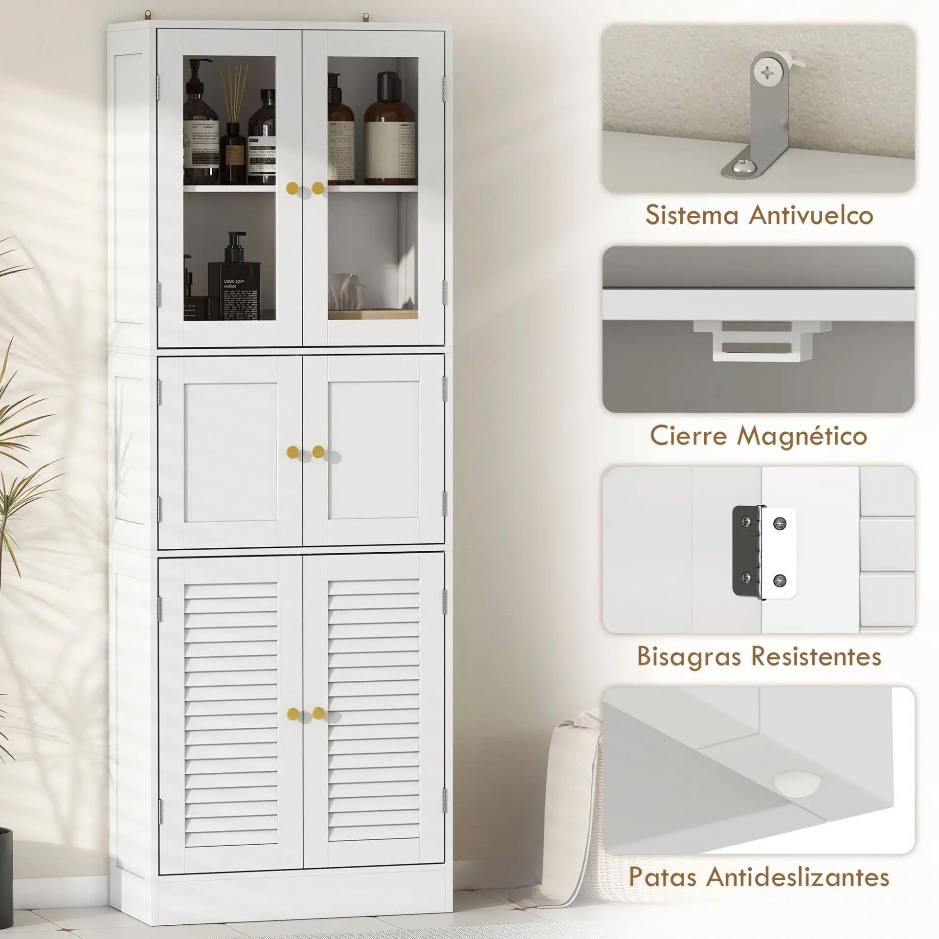 - ESTABLE Y SEGURO: El armario alto de baño incluye anti-vuelco y patas con almohadillas antideslizantes para mayor seguridad. Sus bisagras resistentes y cierres magnéticos garantizan un uso cómodo, práctico y duradero en el día a día