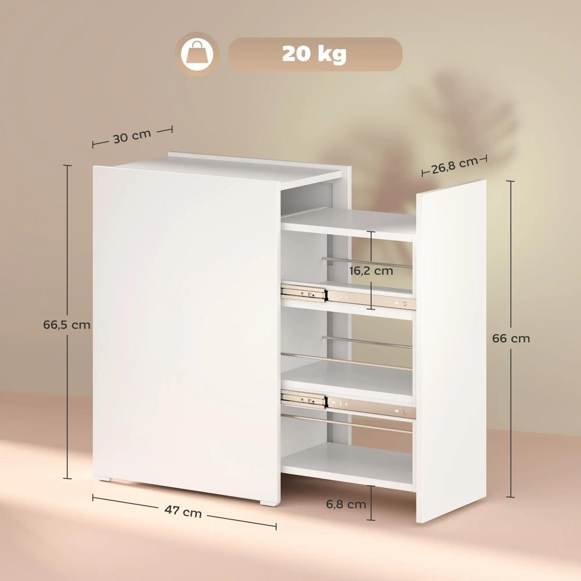 CAJÓN PRÁCTICO: Accede fácilmente a tus esenciales con el cajón de tres niveles. Sus amplios compartimentos son ideales para papel higiénico, productos de limpieza y más. Se desliza suavemente gracias a los rieles y la rueda inferior, facilitando su uso