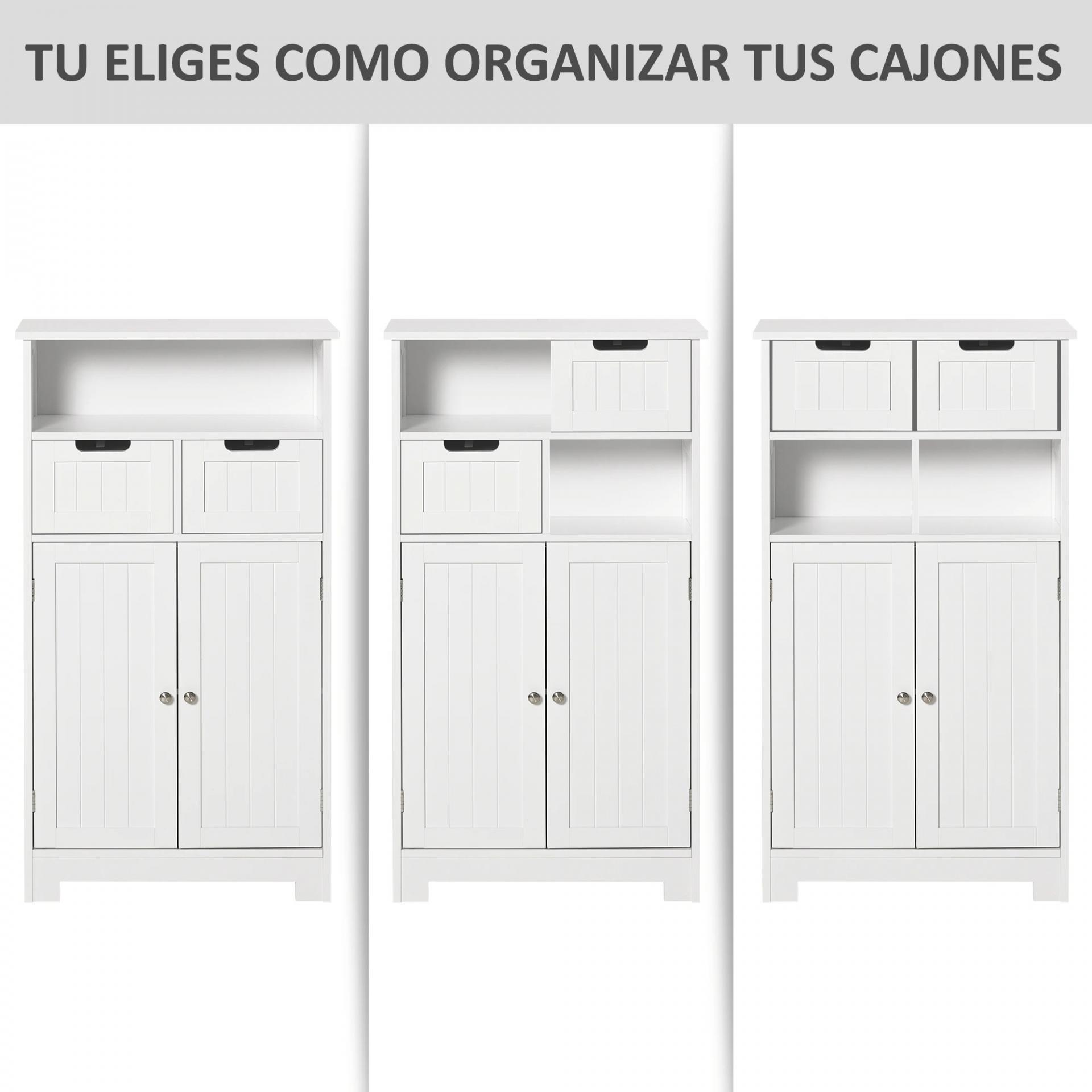 - CON ESTANTE Y CAJONES EXTRAÍBLES: En el interior del armario de suelo para baño, hay un estante regulable en altura para adaptar al tamaño de tus objetos. Los 2 cajones se pueden mover o quitar para personalizarlo a tu gusto
