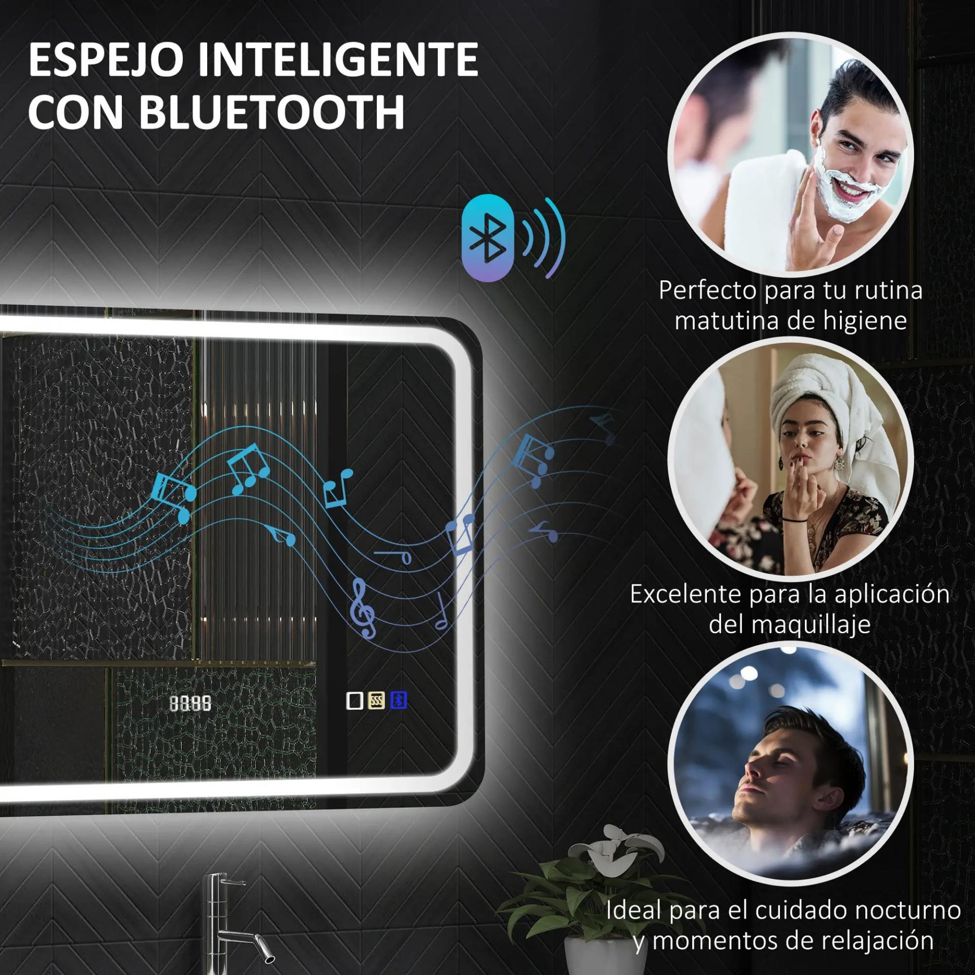 - CON BLUETOOTH Y RELOJ: Haz tus mañanas más agradables con este espejo para baño. Con Bluetooth integrado, puedes escuchar tus canciones favoritas mientras te arreglas. Además, el reloj integrado te ayuda a controlar el tiempo