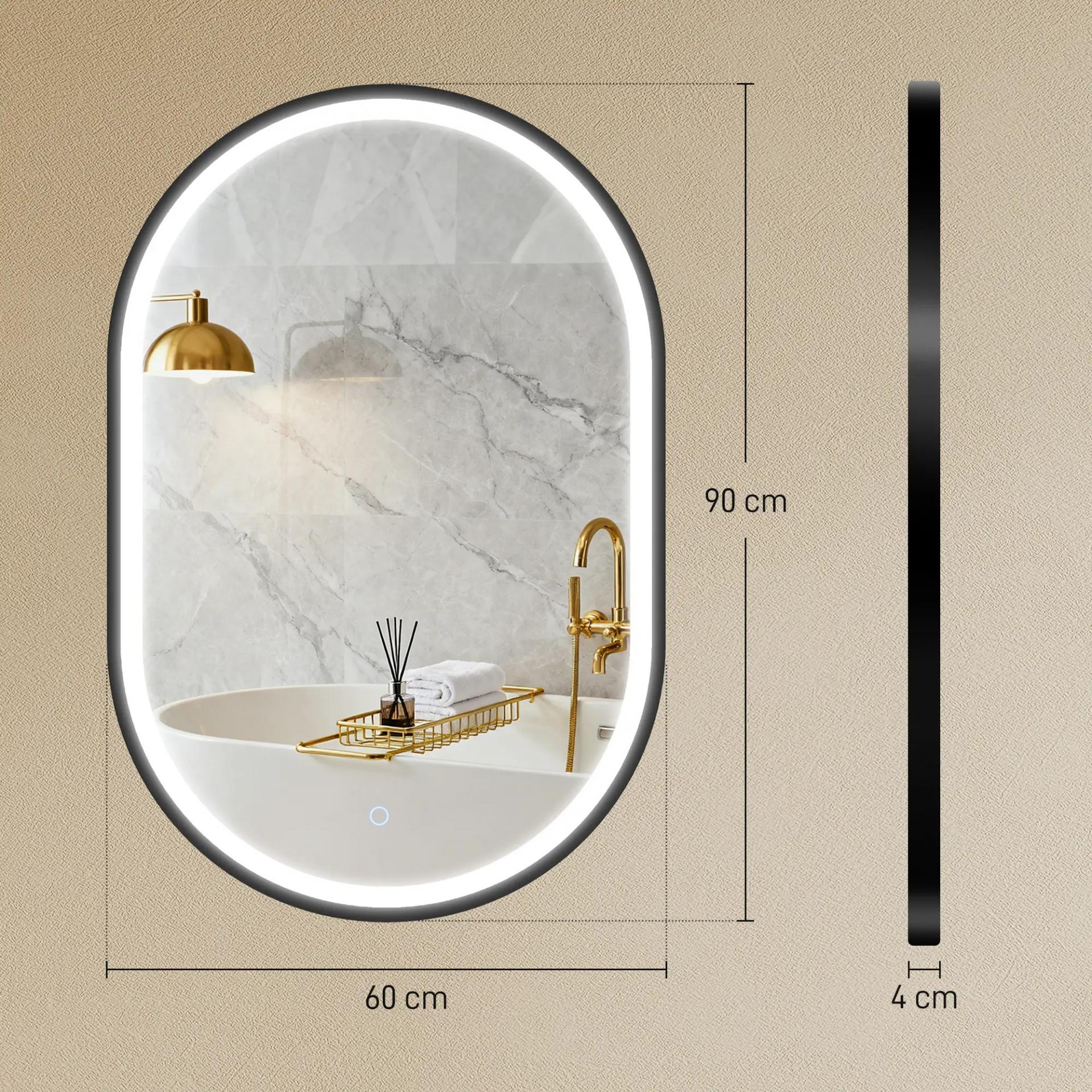 Espejo de Baño con Luz 60x90 cm Espejo de Pared Ovalado 3 Colores de Luz Brillo Regulable Función Antivaho Negro