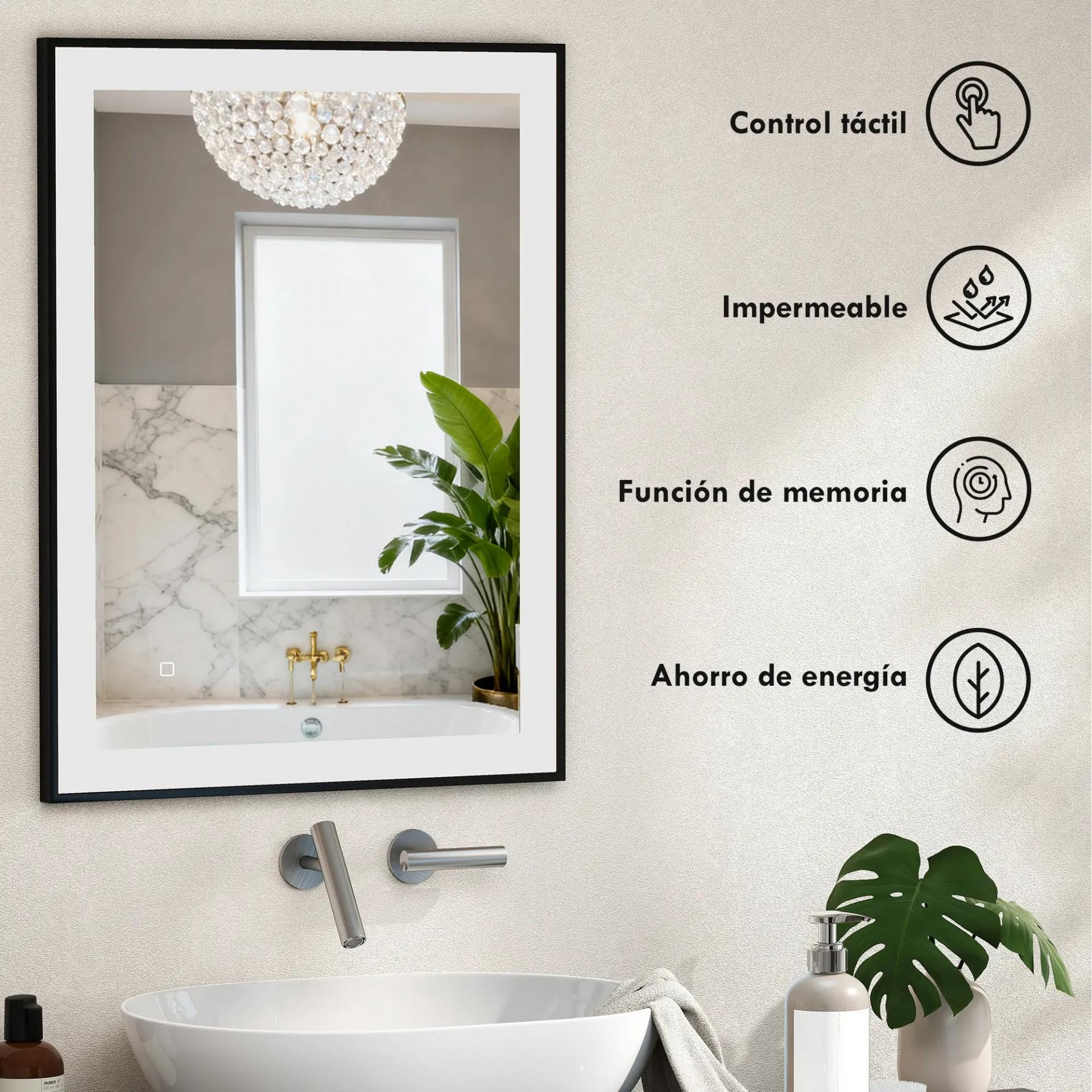 ILUMINACIÓN AJUSTABLE: El espejo de baño cuenta con 208 luces LED y superficie amplia. Ajusta brillo y color (3000K, 4500K, 6500K) con un botón. La función memoria guarda tu última configuración para mayor comodidad