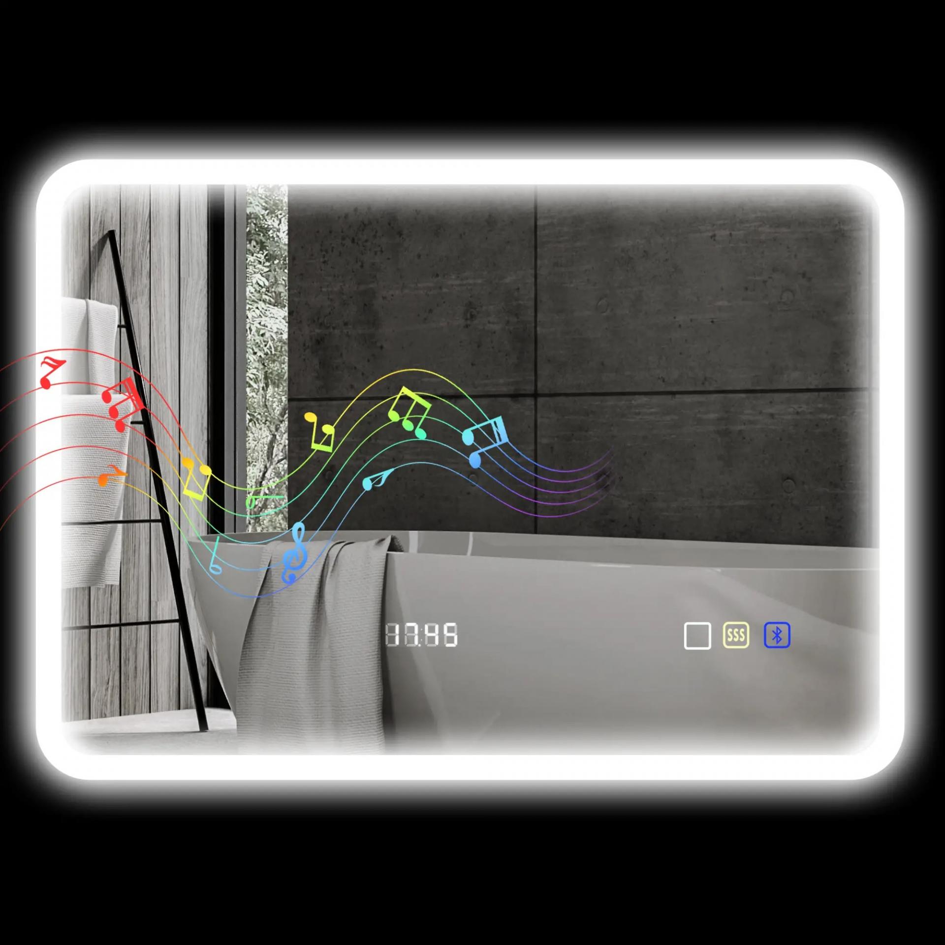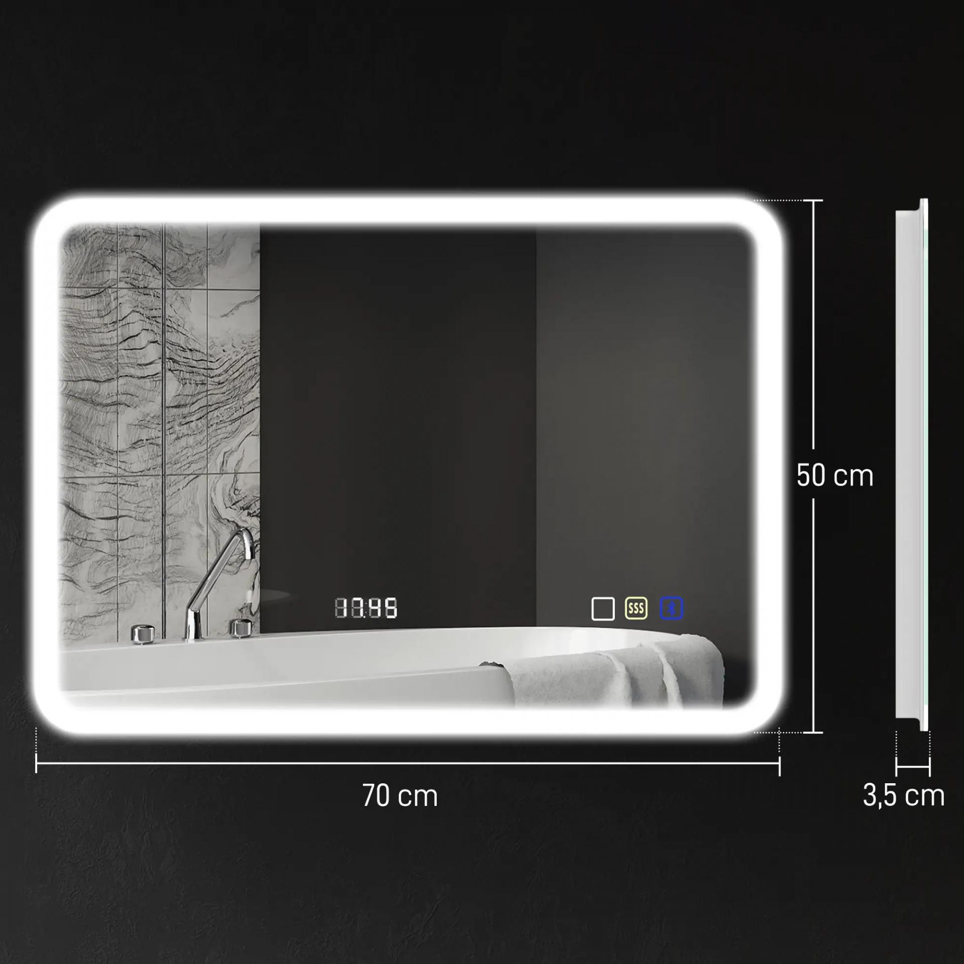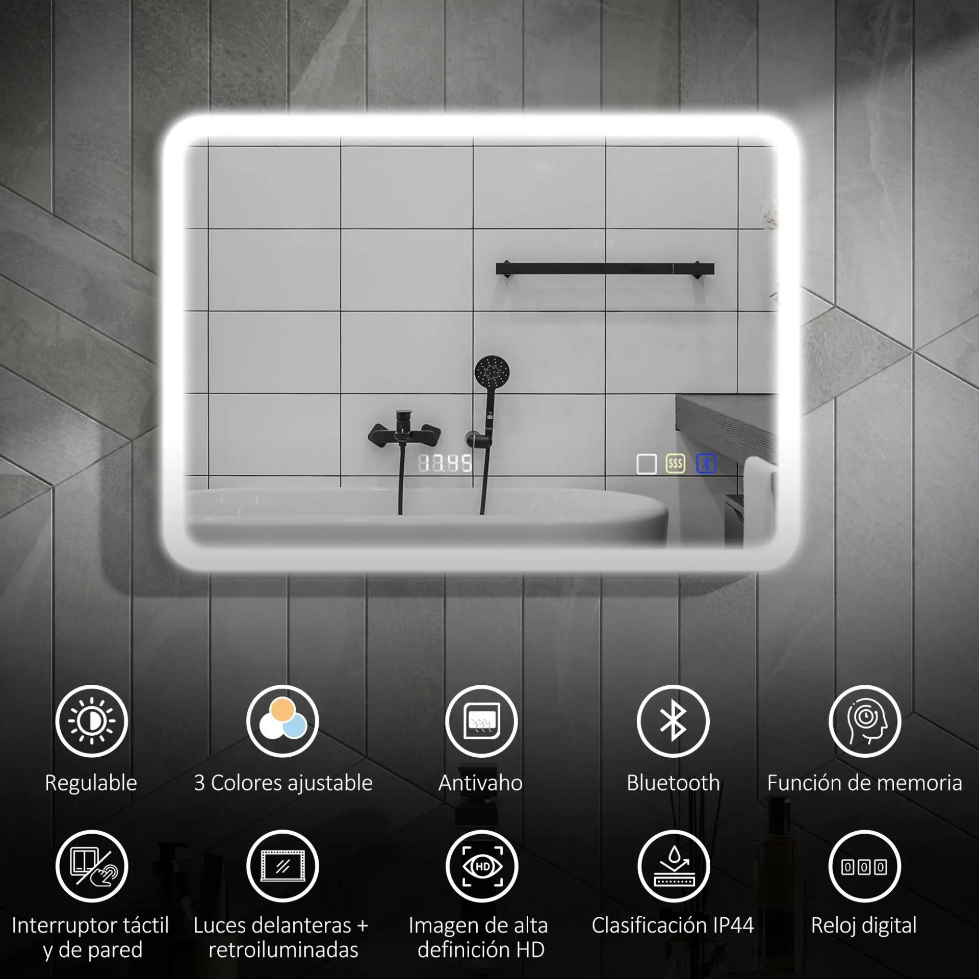 Espejo de Baño con Luz LED 70x50 cm con Bluetooth 3 Colores de Luz Reloj Digital Función Antivaho Función de Memoria
