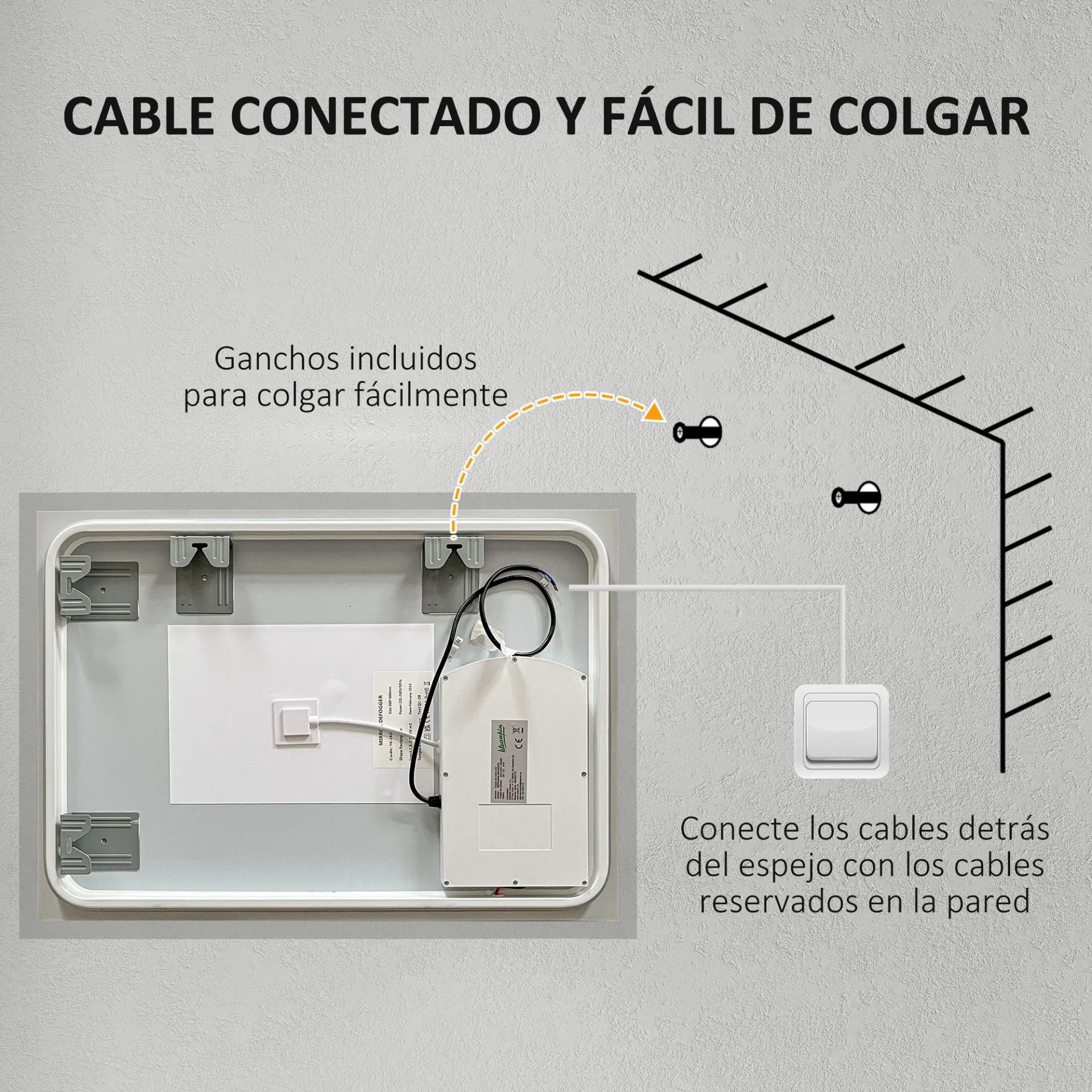 MEDIDAS TOTALES: 70x50x3 cm (LxANxAL). Potencia: 31 W. Este espejo inteligente con iluminación led se conecta directamente al cableado de corriente de tu casa, no incluye ningún tipo de adaptador ni enchufe, la conexión es mediante cables. Se requiere montaje