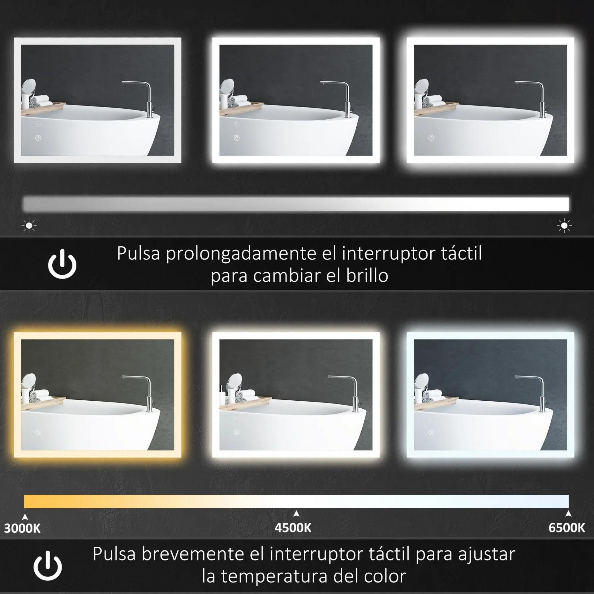 LUZ LED AJUSTABLE: Este espejo de baño LED ofrece tres temperaturas de luz (3000K cálida, 4500K neutra y 6500K fría) y brillo regulable. Permite cambiar la intensidad con una pulsación larga y ajustar el color con un toque corto en el interruptor táctil