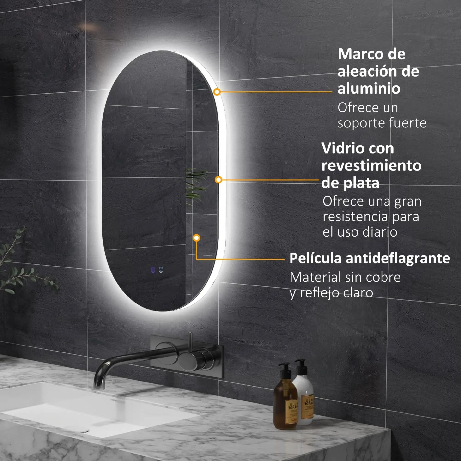 LUZ LED AJUSTABLE: Este espejo para baño dispone de iluminación LED con 3 colores de luz seleccionables (blanco cálido 3000K, blanco 4500K y blanco frío 6500K) y brillo ajustable. Simplemente, toca el interruptor con un toque largo para cambiar el brillo y un toque corto para ajustar el color de la luz. Además, al estar en los laterales hace que la luz sea más suave y elegante
