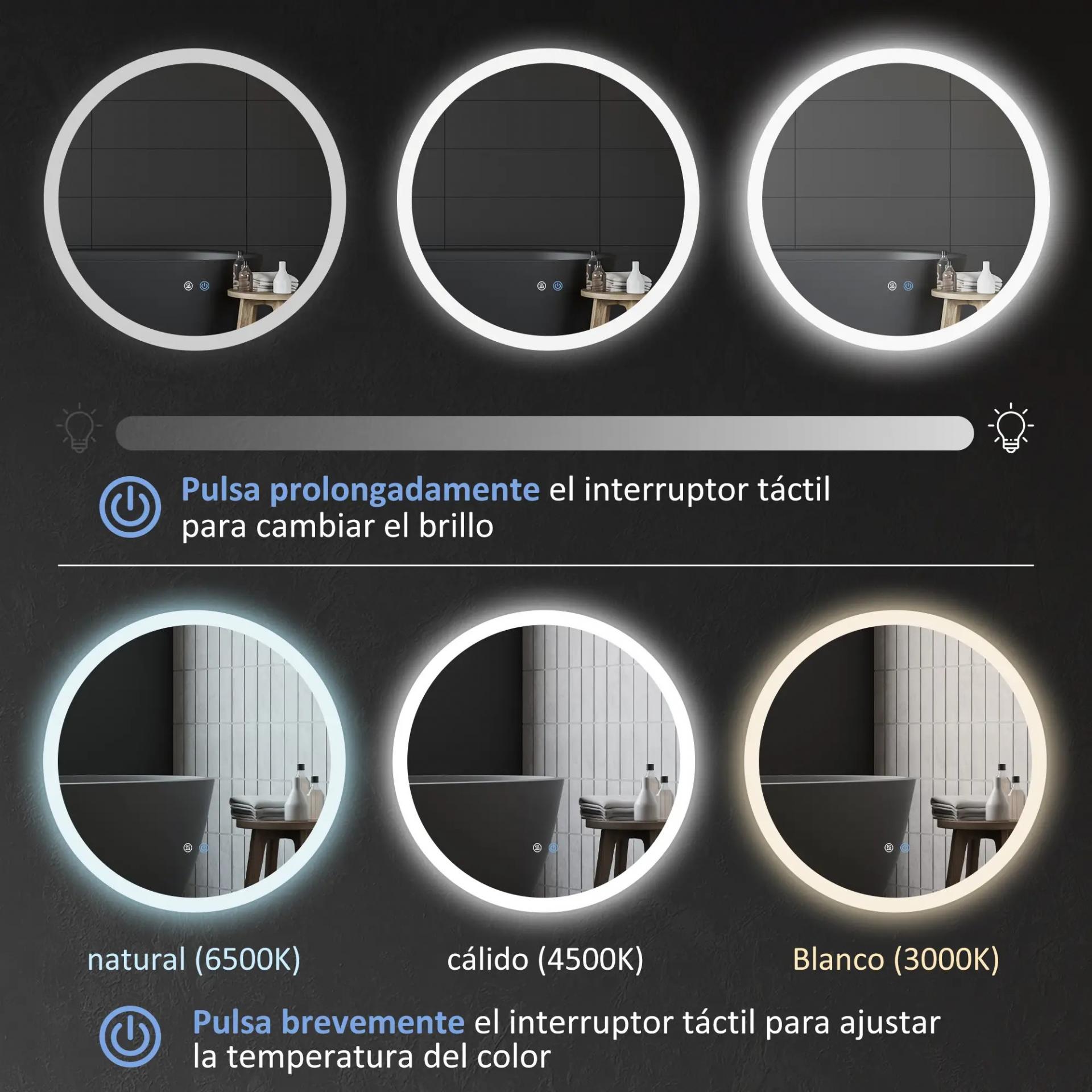 LUZ LED AJUSTABLE: Este espejo cuenta con iluminación LED de 3 tonos (blanco cálido 3000K, blanco 4500K y blanco frío 6500K) y brillo regulable. Pulsa brevemente para cambiar color y mantén pulsado para ajustar el brillo