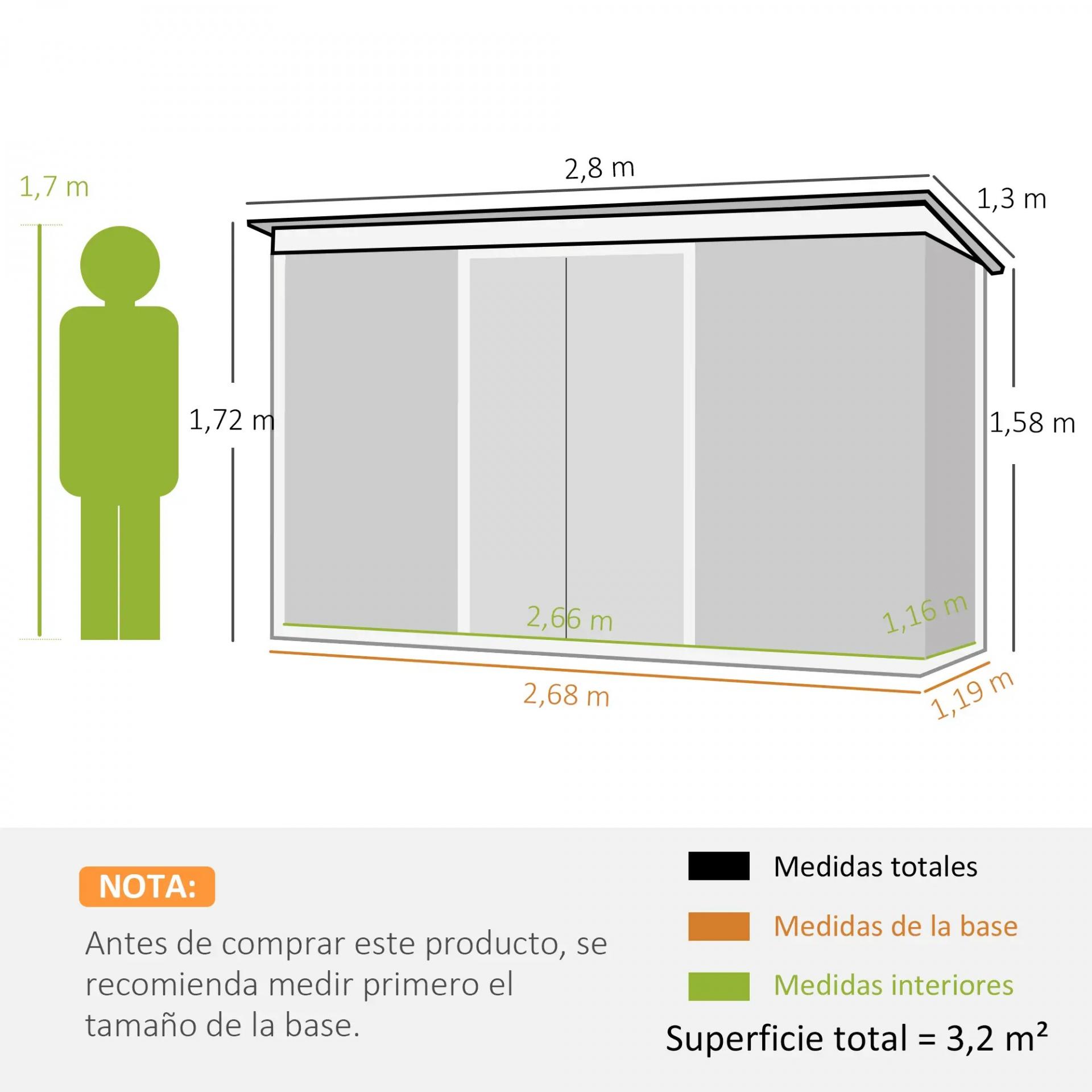 - MEDIDAS TOTALES: 280x130x158-172 cm (LxANxAL). Medidas de la puerta: 96x152 cm (LxAN). Medidas interiores: 266x116 cm (LxAN). Se requieren 2 personas para su montaje en aproximadamente tres horas. SIEMPRE usar guantes. No instalar con viento