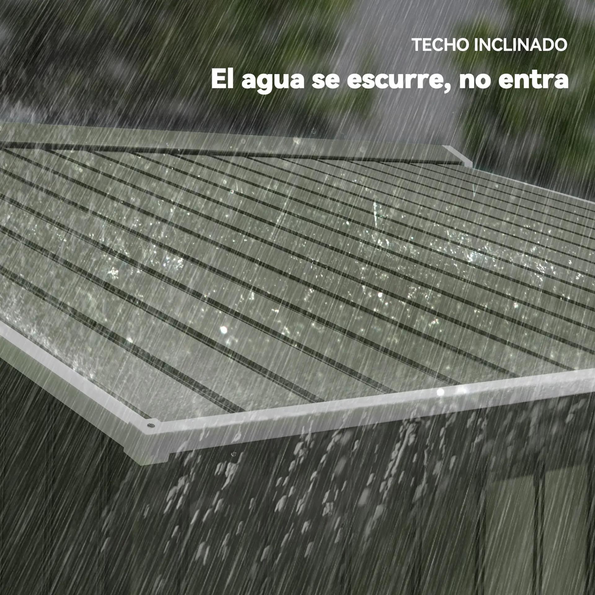 - TECHO A DOS AGUAS Y PUERTAS CORREDERAS: El tejado inclinado del cobertizo de jardín permite que el agua de lluvia escurra fácilmente, evitando acumulaciones y oxidación. Sus puertas correderas dobles facilitan el acceso sin ocupar espacio adicional