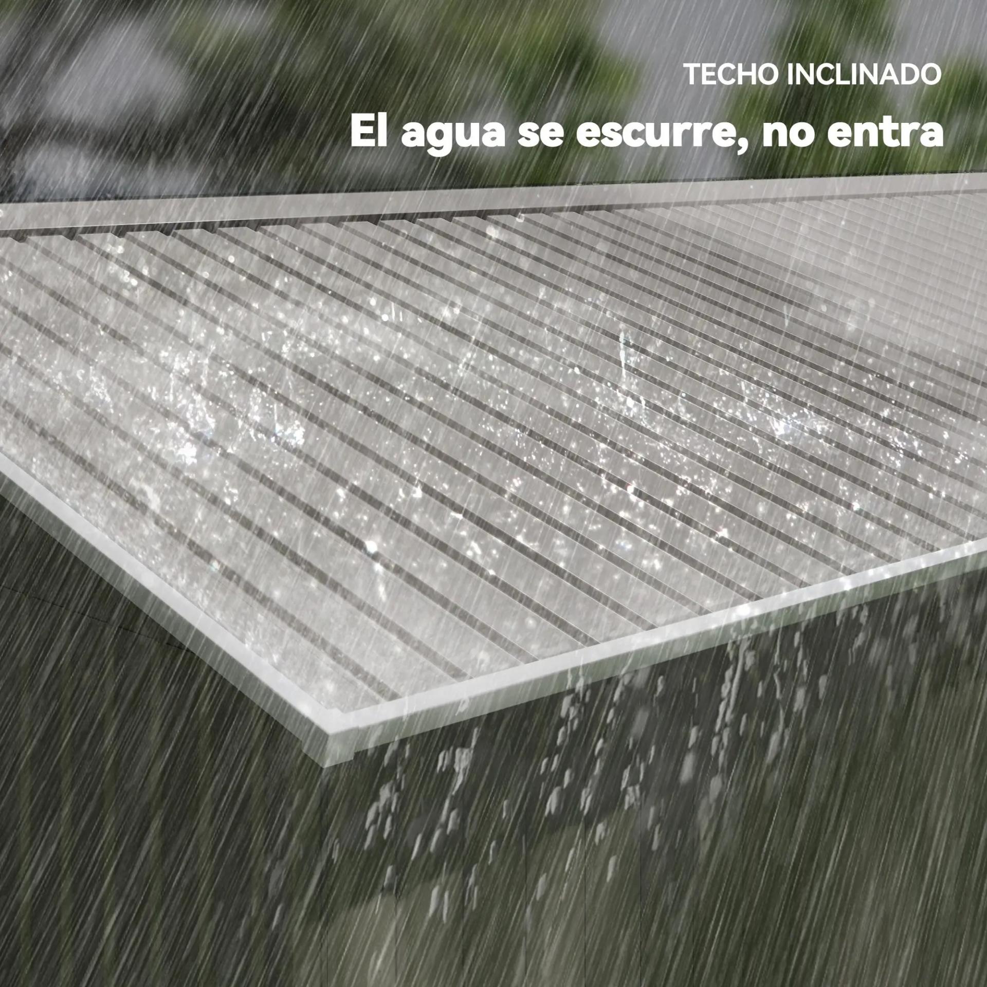 - TECHO INCLINADO Y DOBLE PUERTA: El techo inclinado permite que el agua fluya hacia el suelo, evitando que se estanque y se oxide la caseta. Sus dos puertas correderas facilitan el acceso al interior sin obstruir el paso, incluso al mover objetos grandes. Ofrece la opción de cerrarse con candado (no incluido) para mayor seguridad