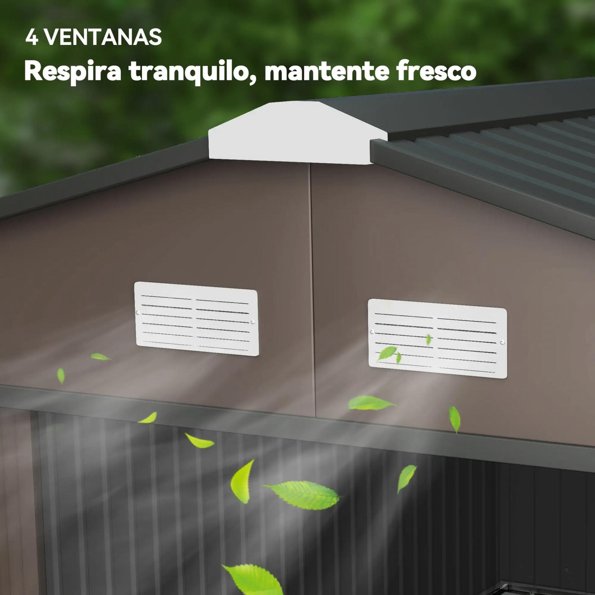 - BUENA VENTILACIÓN: El cobertizo de jardín de acero cuenta con 4 rejillas de ventilación en la parte superior, dos en la parte frontal y dos en la parte posterior. Garantizan una buena ventilación, evitando la humedad y la aparición de moho en las herramientas y demás equipos