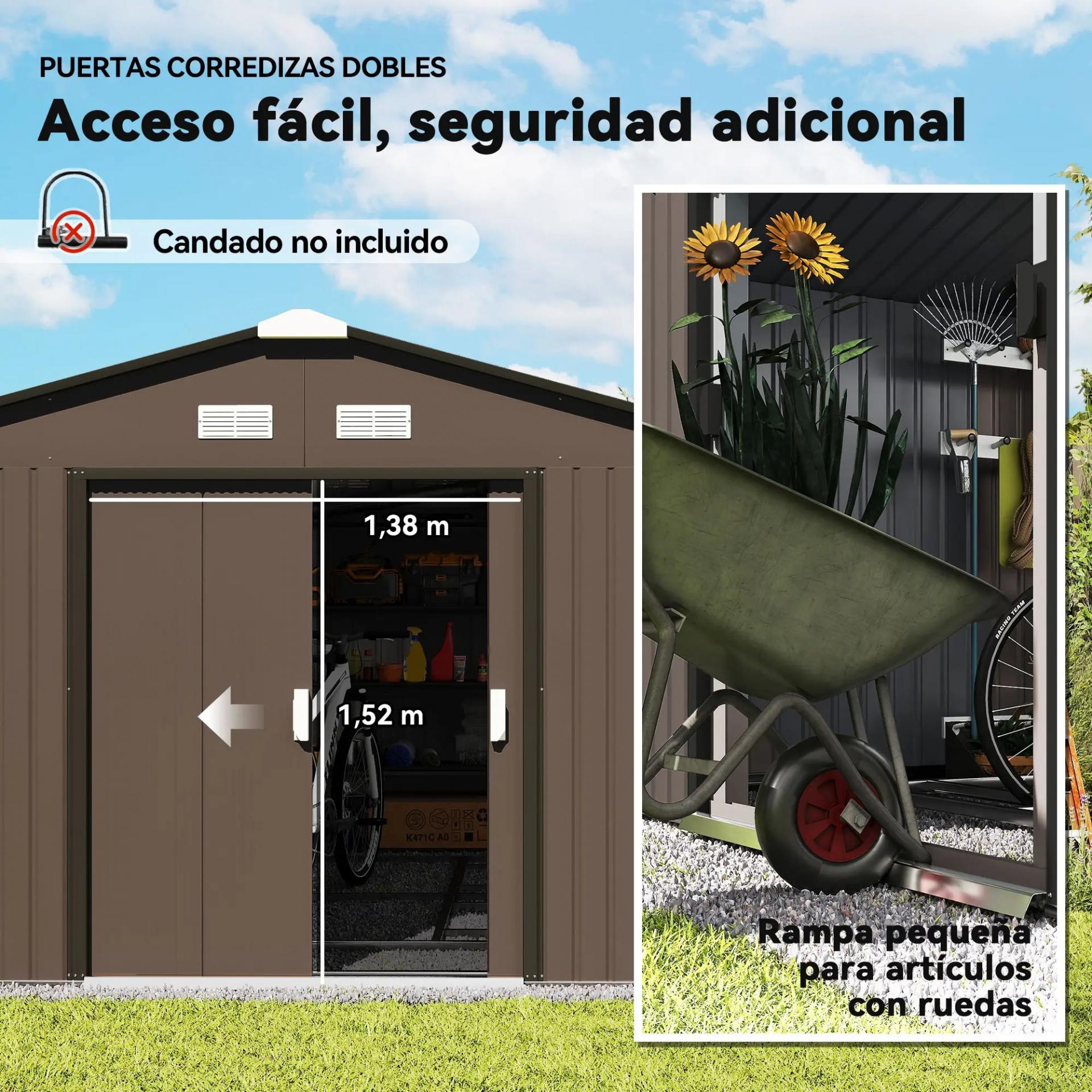 - TECHO INCLINADO Y DOBLE PUERTA: El techo inclinado permite que el agua fluya hacia el suelo, evitando que se estanque y se oxide la caseta. Sus dos puertas correderas facilitan el acceso al interior sin obstruir el paso, incluso al mover objetos grandes. Ofrece la opción de cerrarse con candado (no incluido) para mayor seguridad