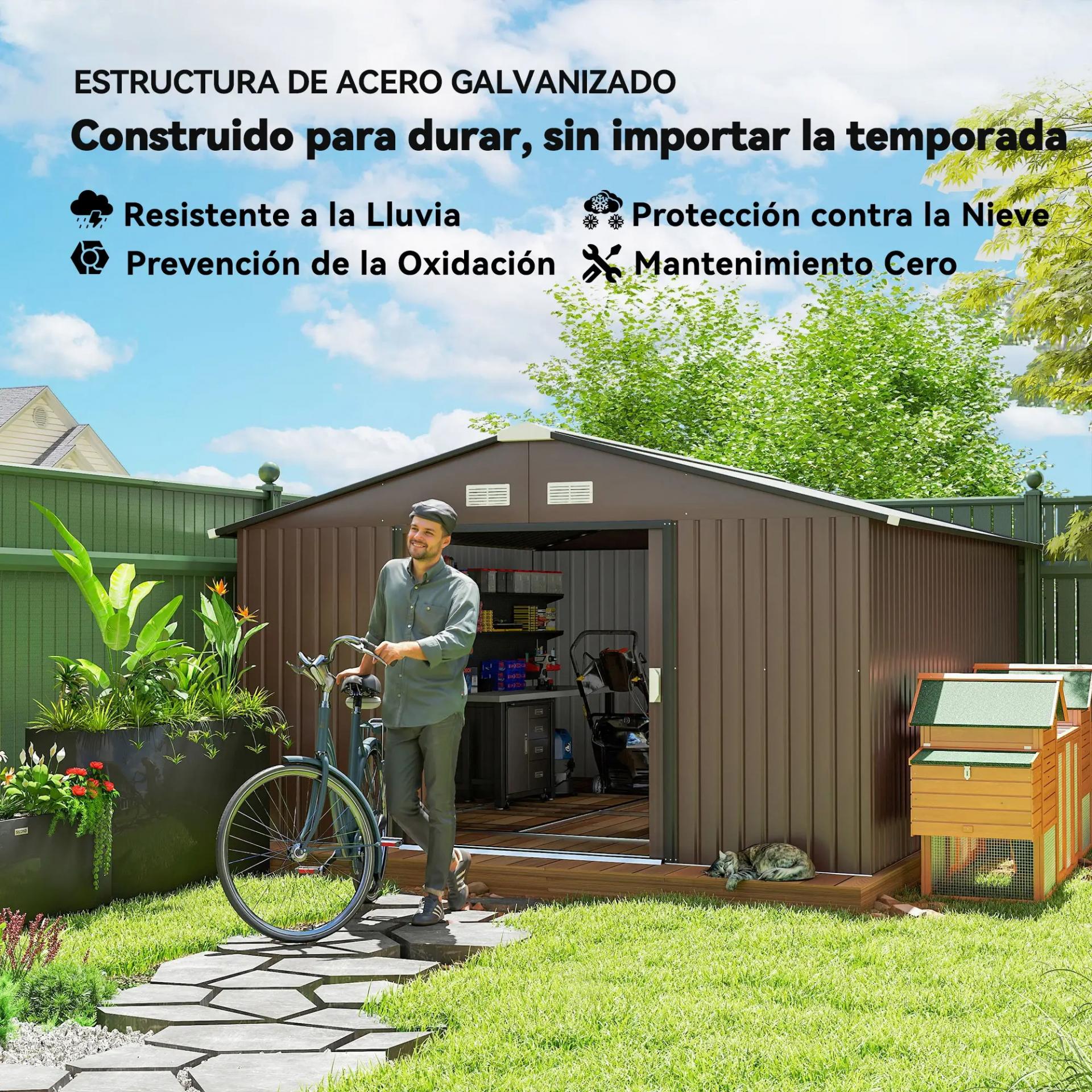 - ACERO GALVANIZADO: Caseta de jardín grande con estructura resistente al óxido y recubrimiento anticorrosión. Incluye marco de cimentación para mayor estabilidad. Suelo no incluido. Todas las piezas vienen precortadas y perforadas para fácil montaje