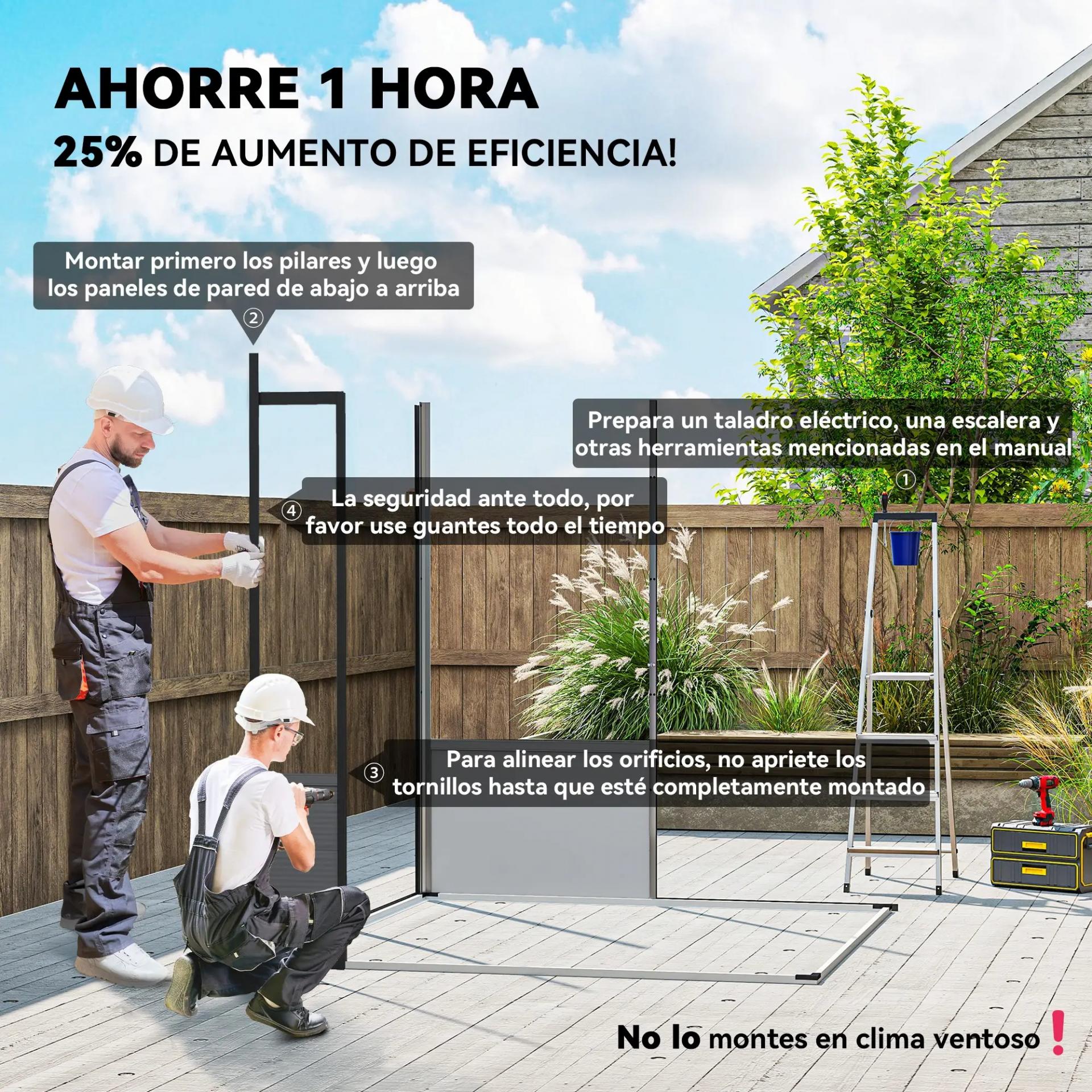 MEDIDAS TOTALES: 190x191x215 cm (ANxPxAL). Altura de aleros: 180/206 cm. Espacio interior: 177x177 cm. El montaje requiere de 2-3 personas y dura aproximadamente 2 horas. Se recomienda evitar la instalación en condiciones de viento fuerte