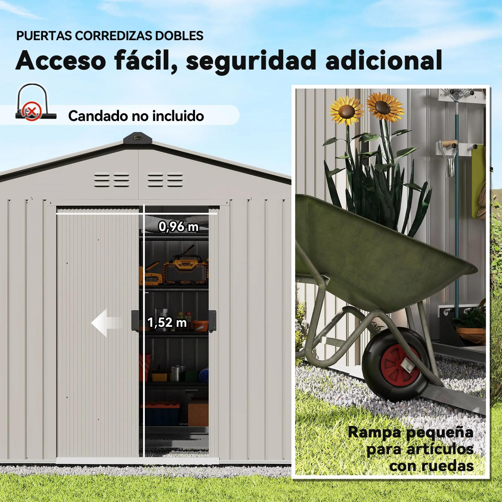 - RESISTENTE Y ESTABLE: El cobertizo metálico está fabricado en acero galvanizado con revestimiento anticorrosivo, ideal para uso prolongado al aire libre. Su estructura con base reforzada, aunque no incluye suelo, garantiza estabilidad y durabilidad