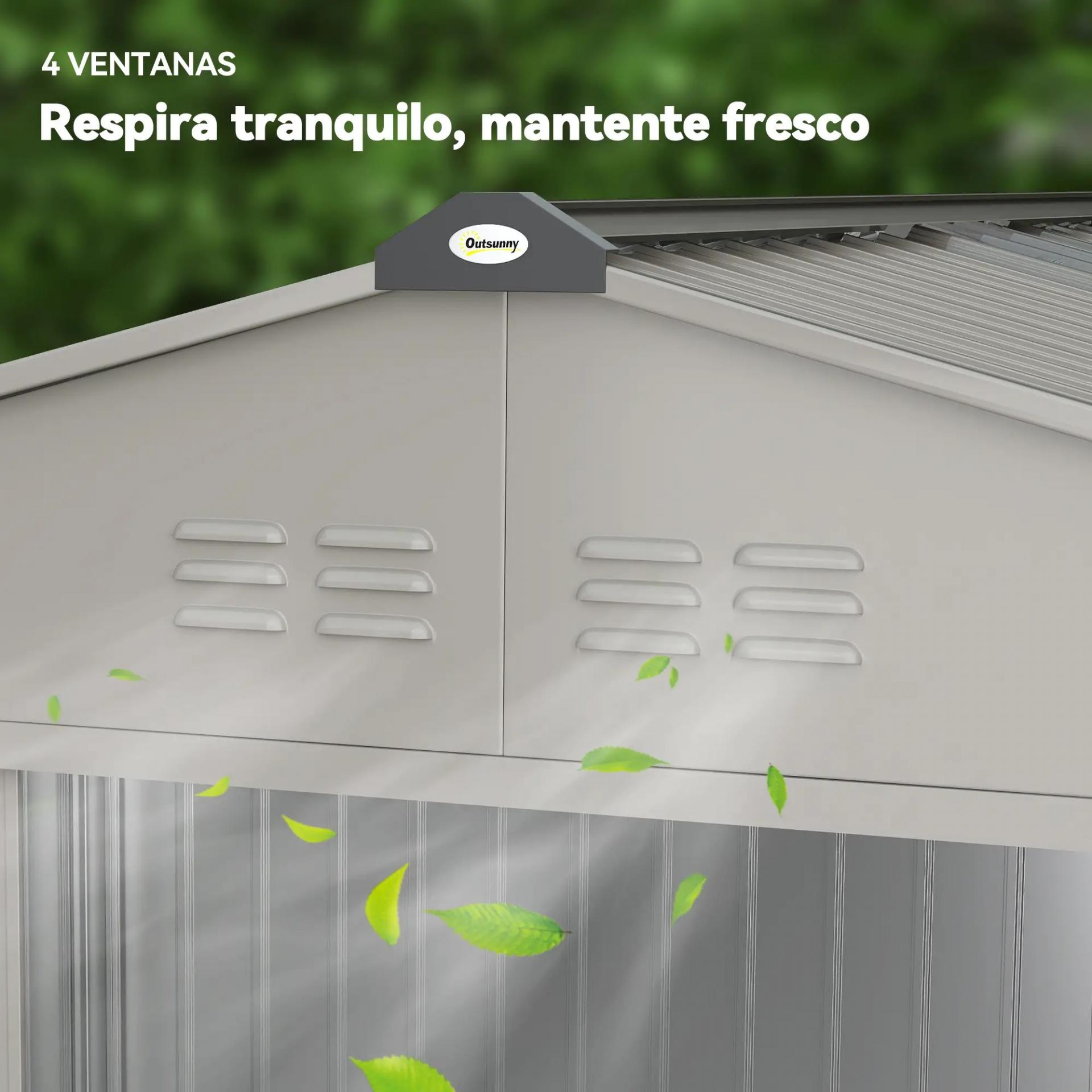 - BUENA VENTILACIÓN: La caseta de exterior cuenta con 4 rejillas de ventilación (2 frontales y 2 traseras) que favorecen la circulación del aire, evitando la humedad y la aparición de moho en las herramientas. Además, el techo cuenta con una claraboya de fibra de vidrio que permite la entrada de luz natural, manteniendo el interior seco