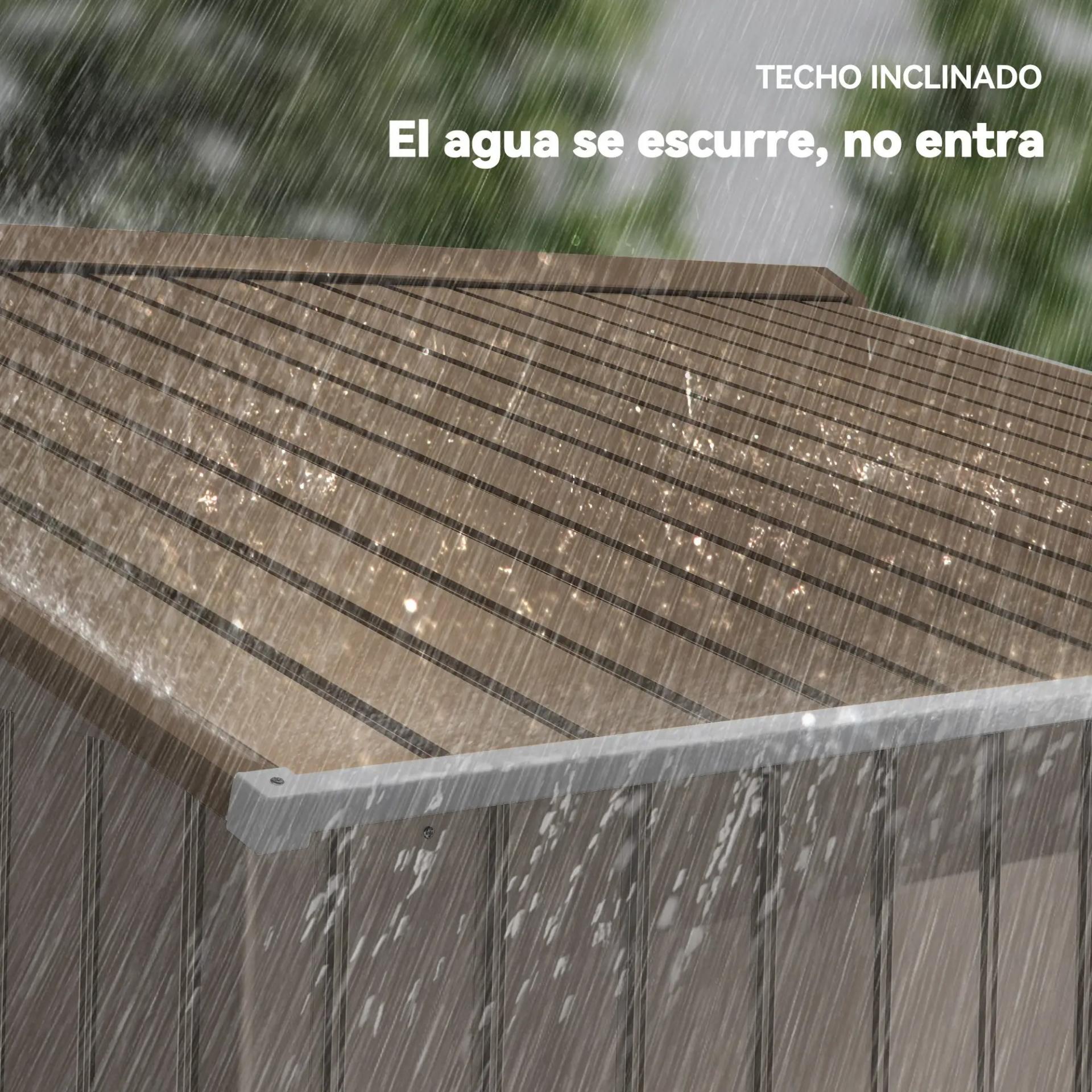 - TECHO INCLINADO Y DOBLE PUERTA: El techo inclinado permite que el agua fluya hacia el suelo, evitando que se estanque y se oxide la caseta. Sus dos puertas correderas facilitan el acceso al interior sin obstruir el paso, incluso al mover objetos grandes. Ofrece la opción de cerrarse con candado (no incluido) para mayor seguridad