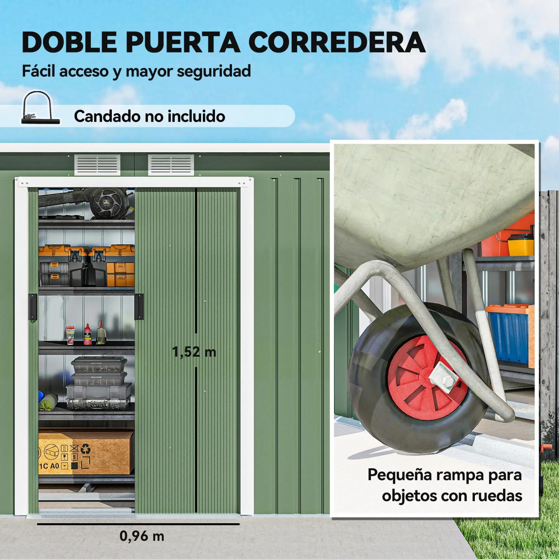 Caseta de Exterior 280x130x172 cm Cobertizo de Jardín con Puertas Correderas Base y Ventilaciones Verde Claro