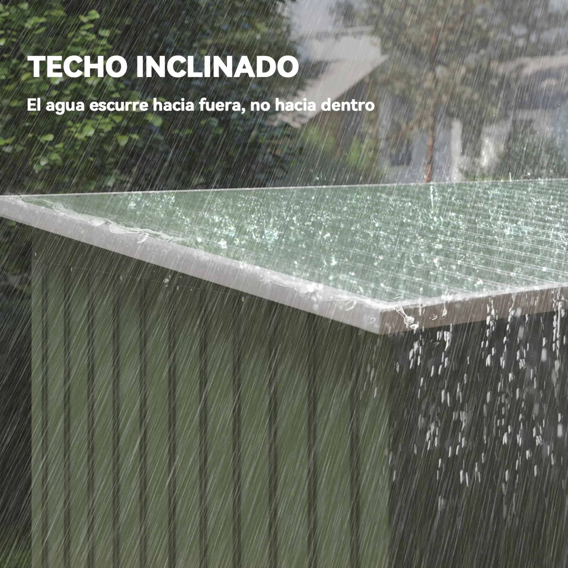 - BUENA VENTILACIÓN Y TECHO INCLINADO: Este cobertizo de jardín de acero está diseñado con dos aberturas frontales que favorecen la ventilación, evitando la acumulación de humedad y la condensación. Además, el techo inclinado permite que el agua drene y no se acumule la nieve