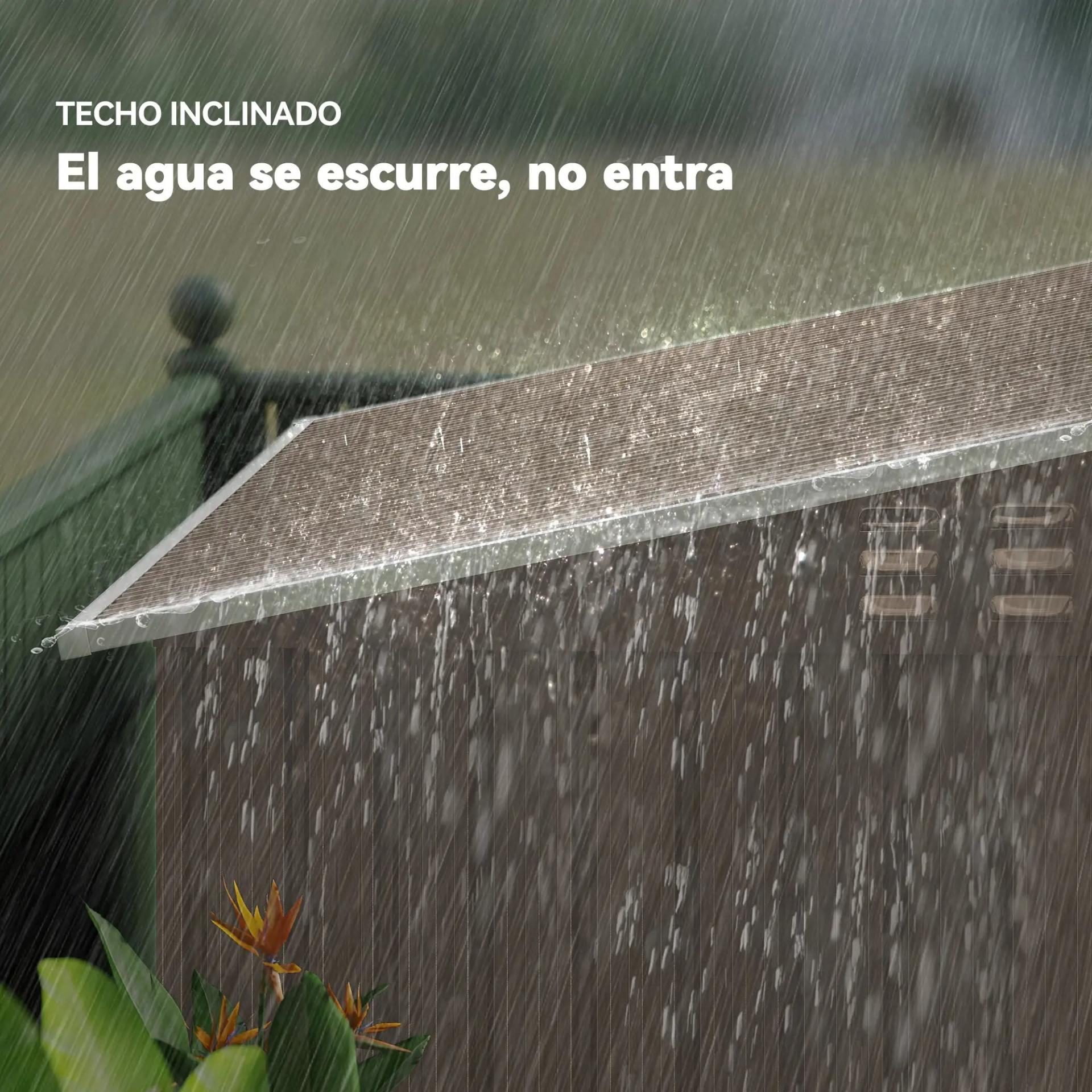 - ACCESO CÓMODO Y PROTECCIÓN: La puerta corredera de la caseta de jardín facilita la entrada y ahorra espacio. El techo inclinado evita la acumulación de agua y nieve, asegurando que el interior se mantenga seco y protegido en todo momento