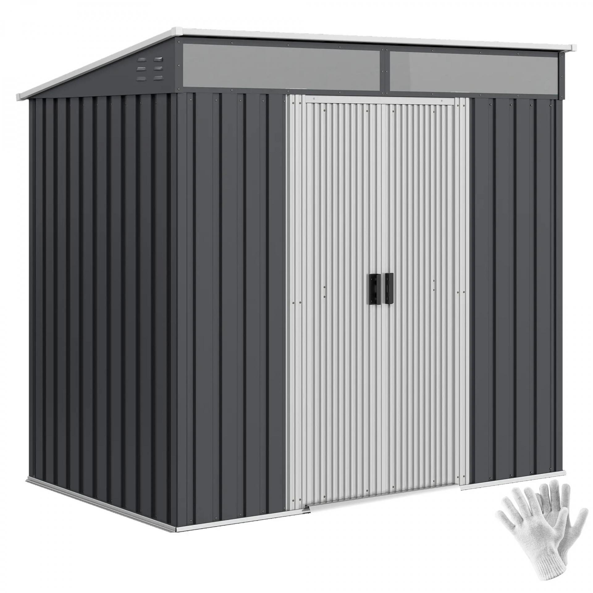 - APTO PARA EXTERIOR: Fabricado en acero galvanizado resistente al agua y rayos UV, este cobertizo metálico con techo inclinado no se desgasta como los de madera, siendo una opción duradera y perfecta para su uso en exteriores