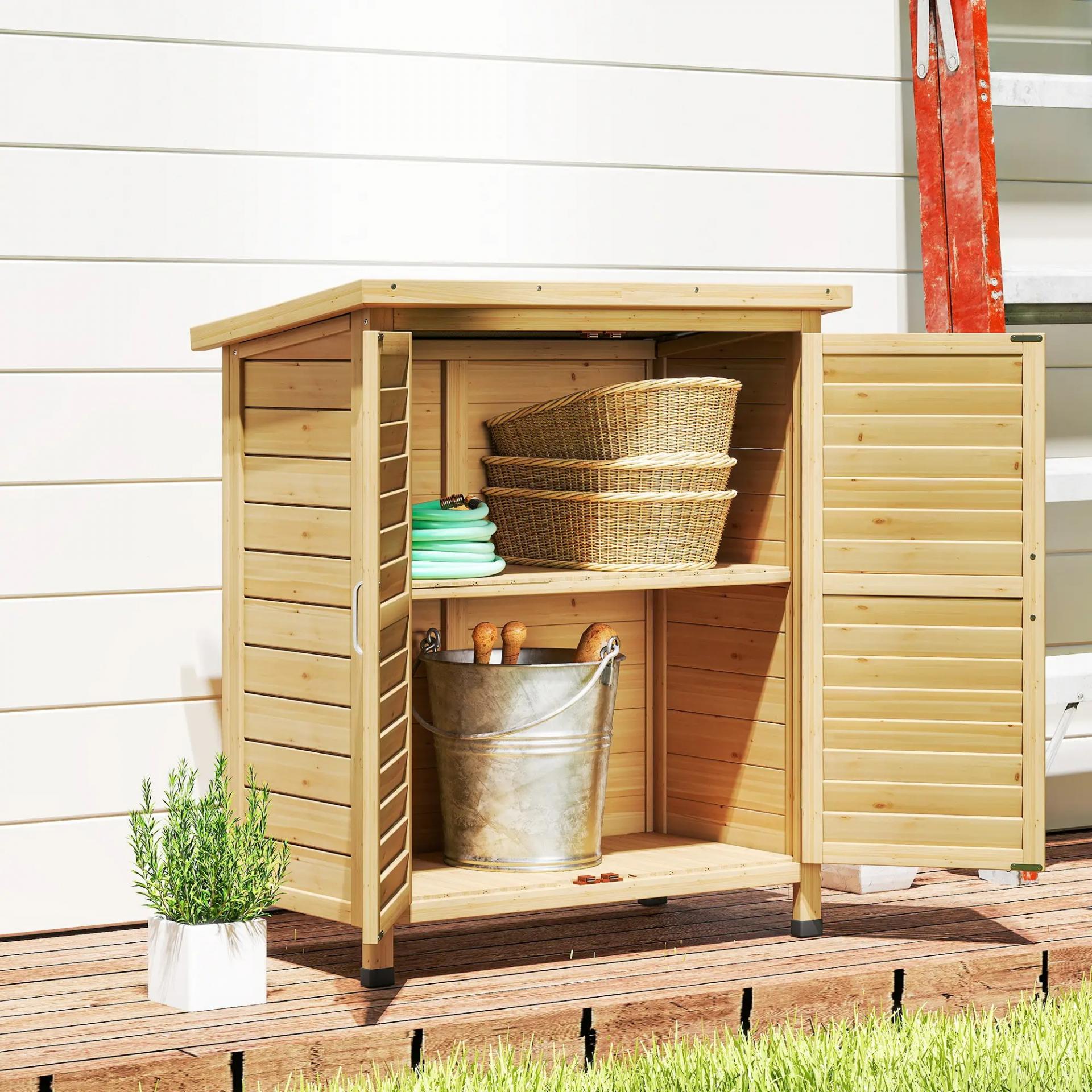 ARMARIO DE MADERA PARA JARDÍN: Este armario de madera para jardín cuenta con 2 grandes estantes que ofrecen un amplio espacio de almacenamiento. Ideal para guardar tus herramientas de jardinería, leña u otros artículos