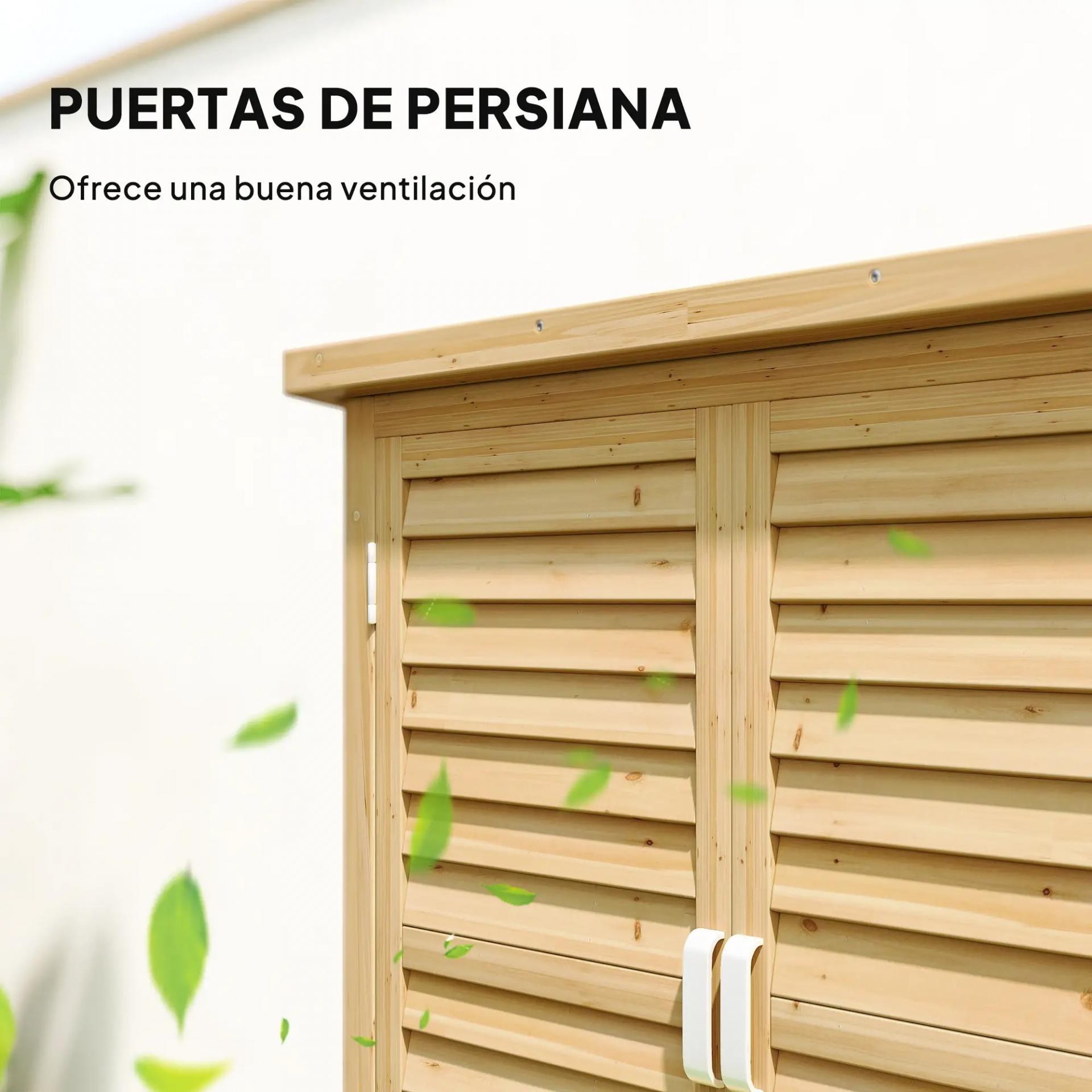 - PUERTAS DE PERSIANA: Las puertas de persiana de esta caseta de madera exterior ofrecen una buena ventilación en el interior y un toque elegante dondequiera que lo coloques. Las puertas cuentan con cierre magnético y tienen asas para facilitar su manejo