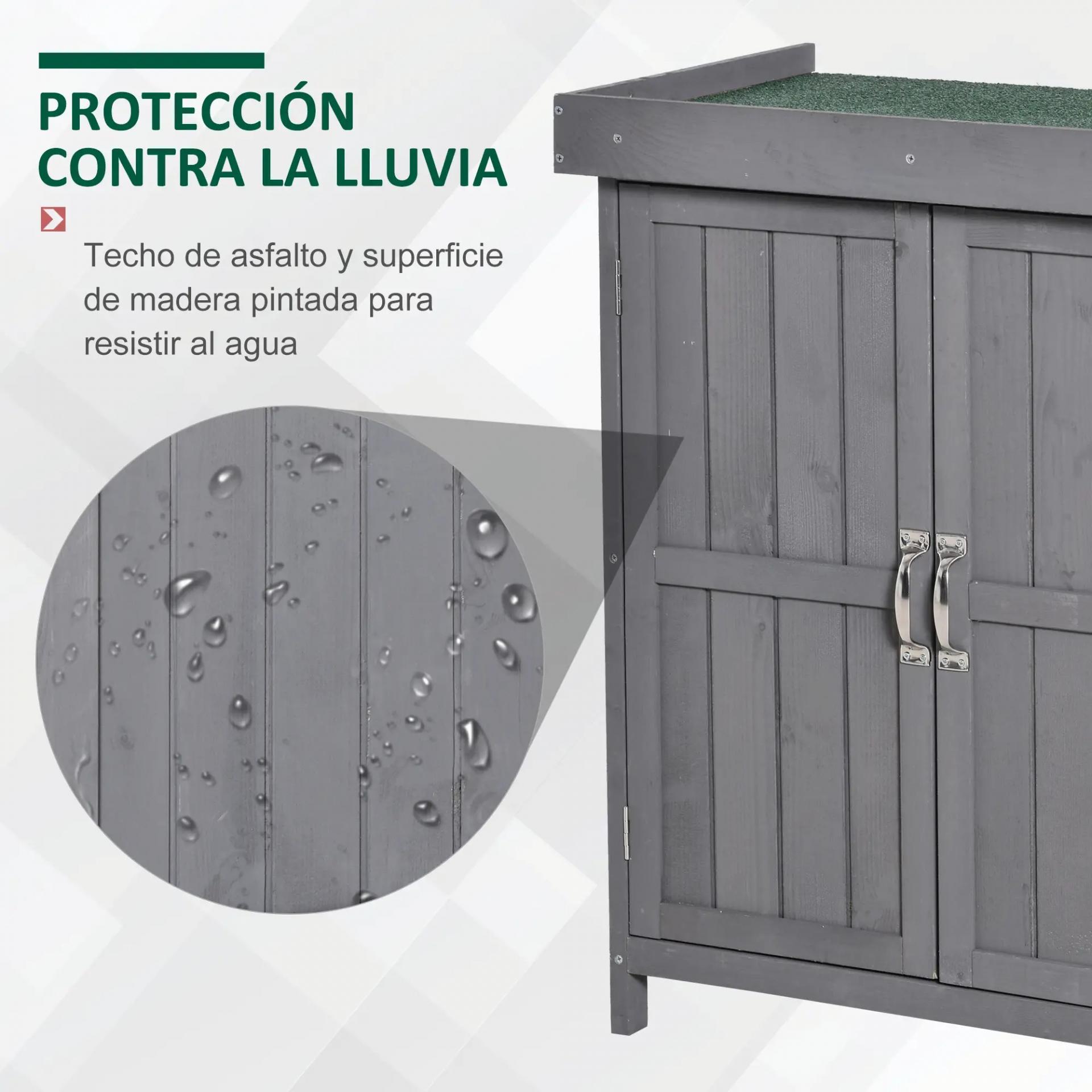 PROTEGE LAS HERRAMIENTAS: Armario cobertizo de jardín con techo asfáltico y superficie de madera lacada con pintura ecológica que es resistente al agua. Su diseño de base elevada protege las herramientas del interior, o troncos de leña si lo usas como leñero, contra la humedad