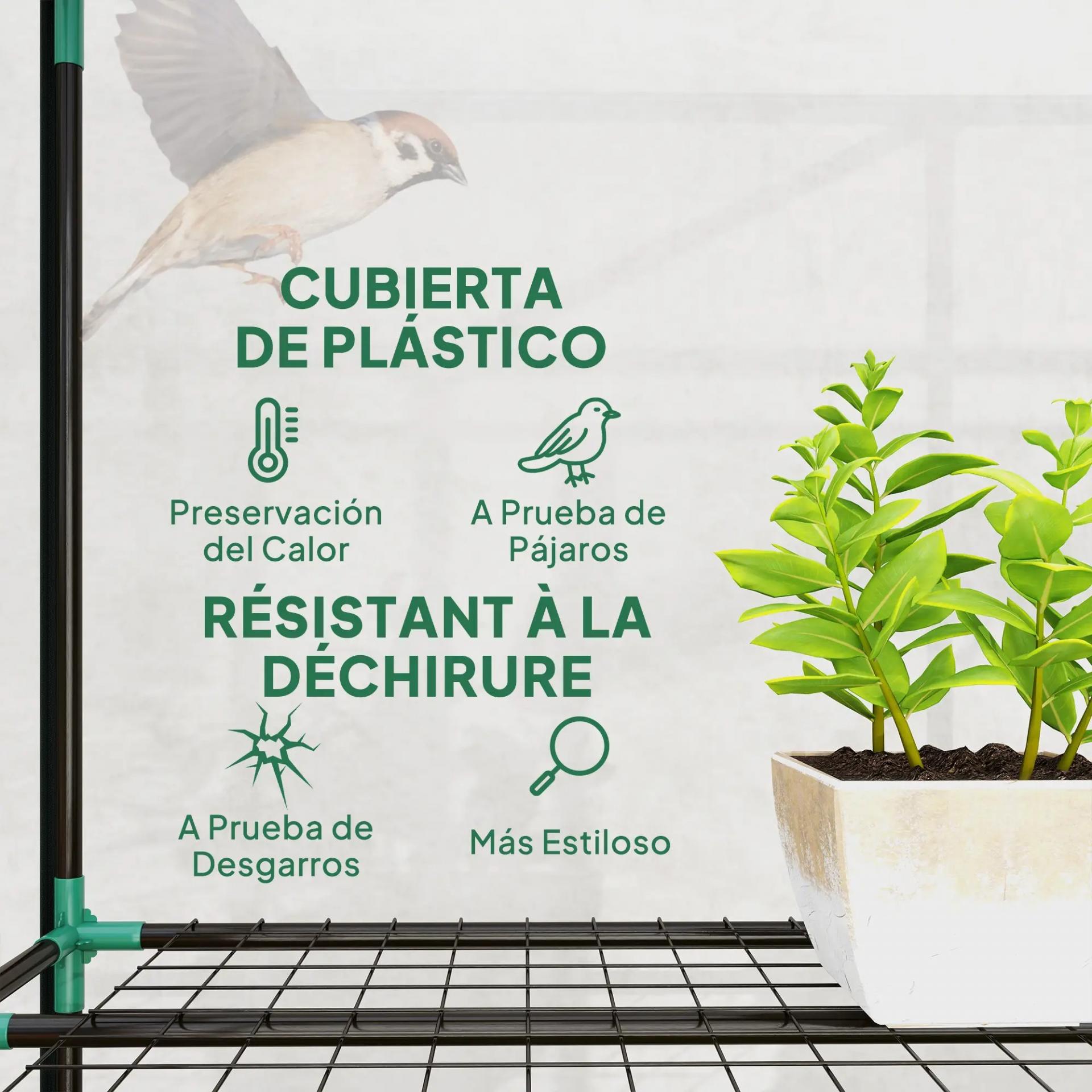 - CUBIERTA DE PLÁSTICO: El invernadero de jardín protege las plantas del viento y la lluvia, permitiendo la entrada de luz solar y reteniendo el calor, favoreciendo su crecimiento saludable
