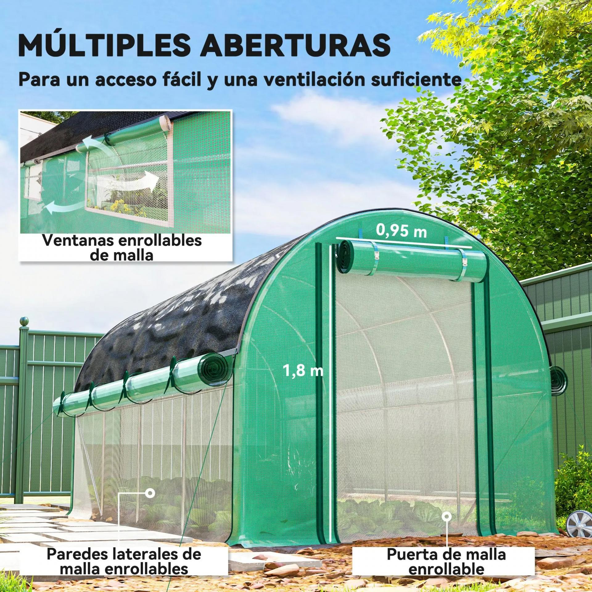 Invernadero de Túnel 4,5x2x2 m con Cubierta PE 140 g/m² Paredes Laterales Enrollables 8 Ventanas y 2 Puertas Verde