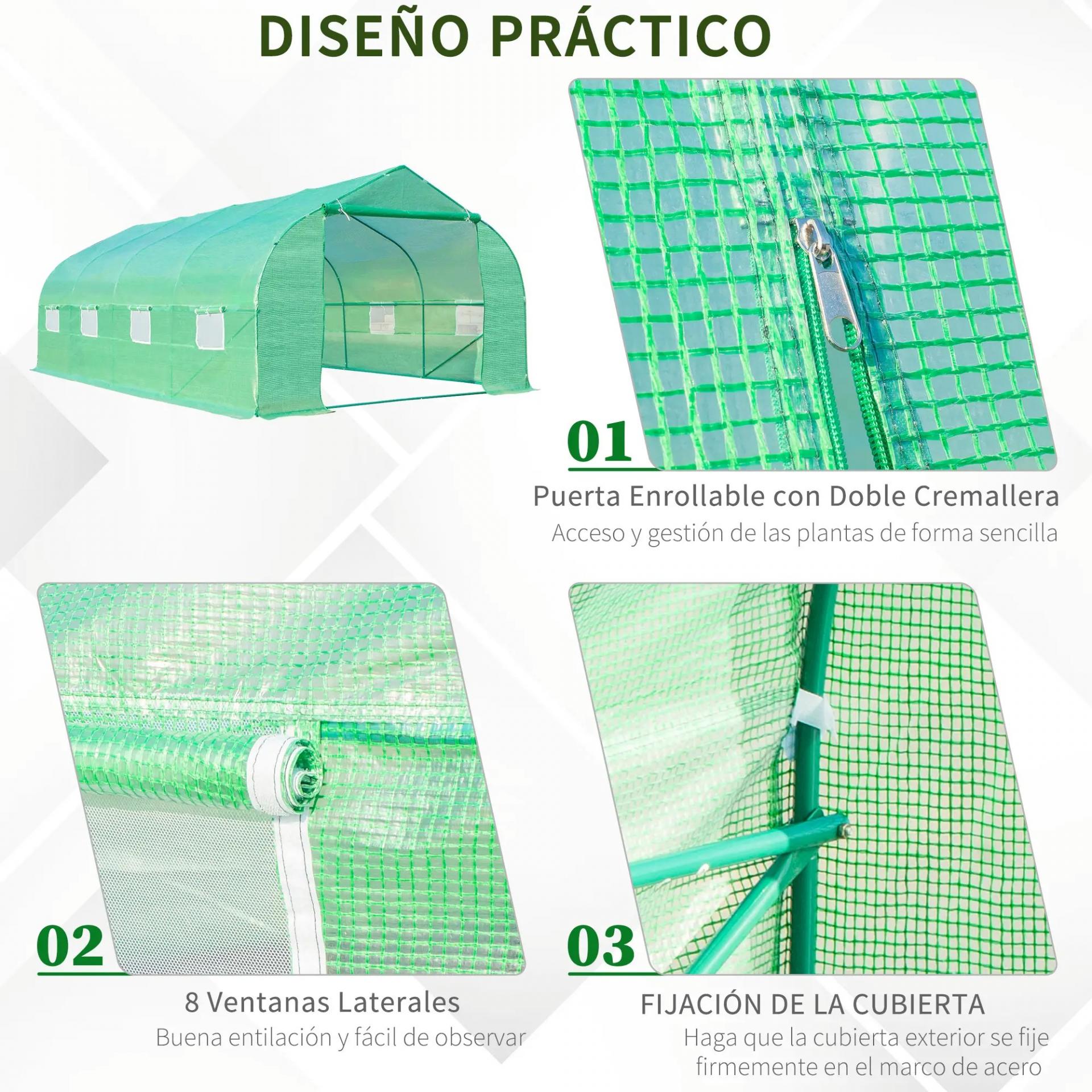- BUENA VENTILACIÓN: Invernadero con muy buena ventilación gracias a las 8 ventanas de malla con cubierta enrollable. 4 en cada lateral para propiciar la ventilación cruzada en los días más calurosos. La puerta con cremallera, que también puede enrollarse y fijarse abierta, facilita además el acceso al interior