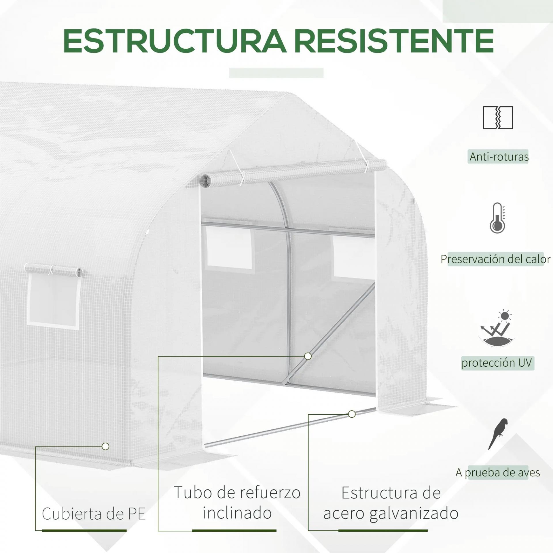 MEDIDAS TOTALES: 445x300x205 cm (LxANxAL). NOTA: No utiliza pesticidas ácidos para evitar reacciones químicas con la cubierta de PE alcalina, que provocan roturas. Por favor, guarda la cubierta en caso de nevada, viento fuerte y lluvia intensa