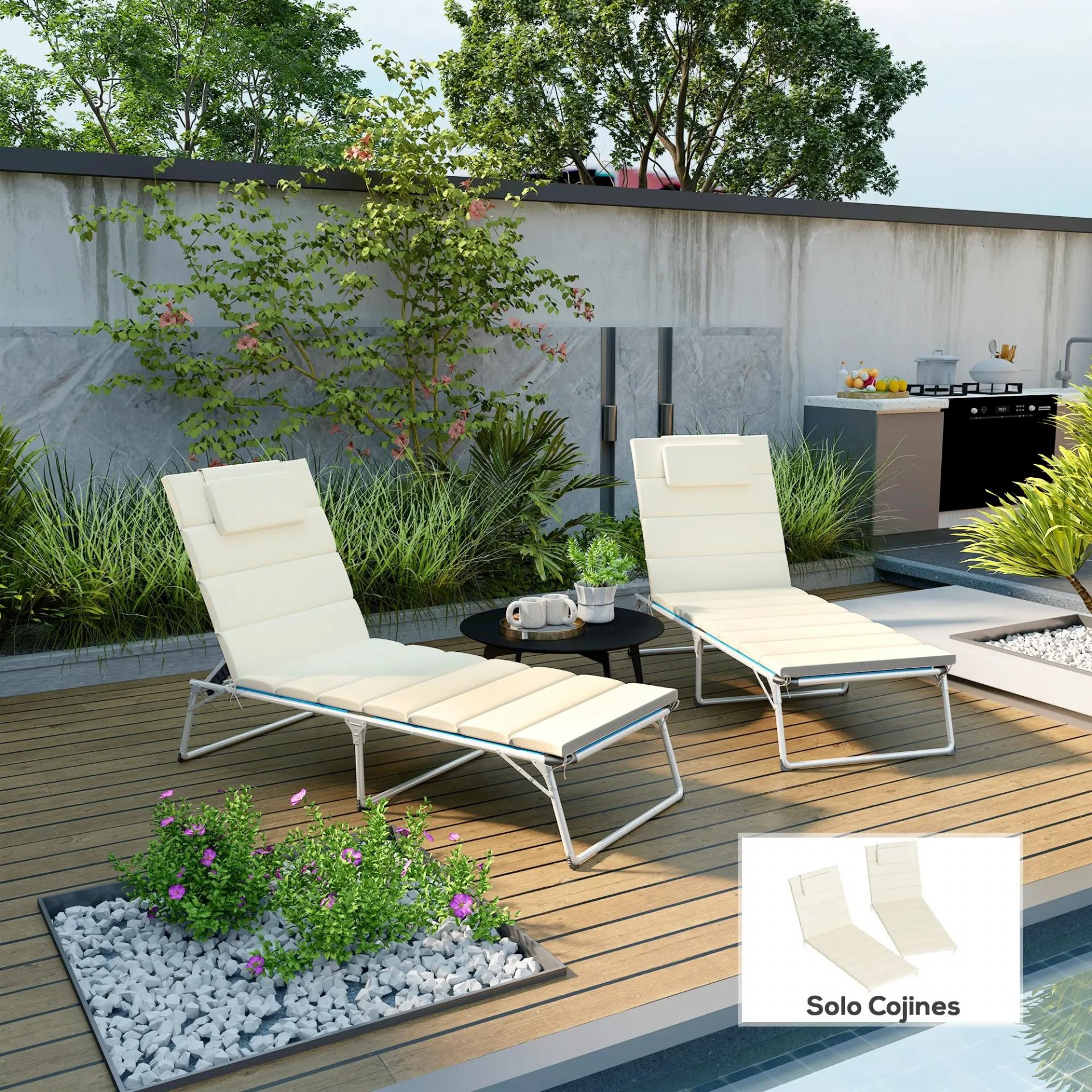 Pack 2 Cojines para Tumbonas Plegables 203x66x3 cm con Reposacabezas y Correas de Sujeción Crema