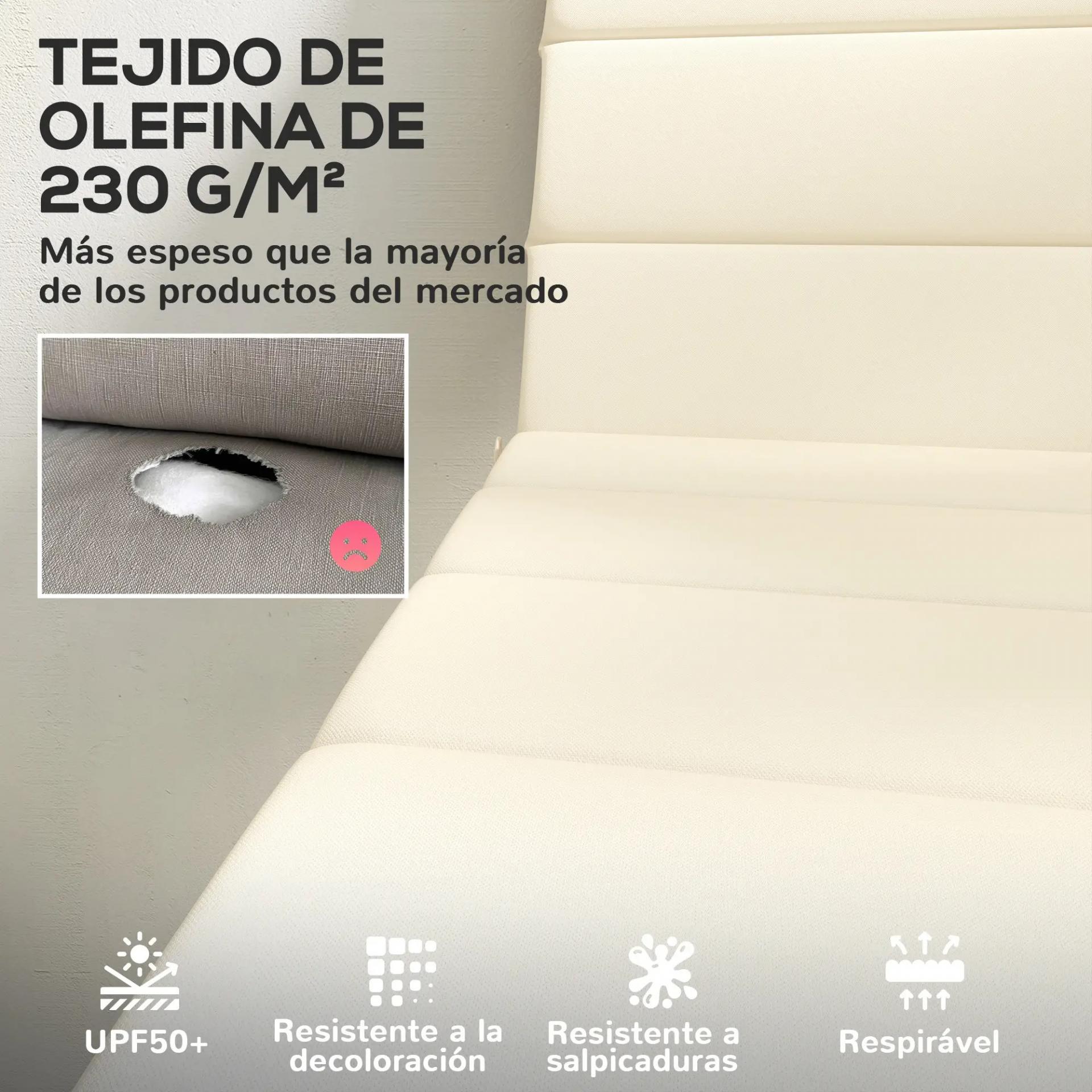TEJIDO OLEFIN: Nuestros cojines para tumbonas de jardín están fabricados con tejido Olefin, que cuenta con un revestimiento UPF50+ para protección contra la decoloración. Son resistentes a manchas leves y salpicaduras, facilitando la limpieza