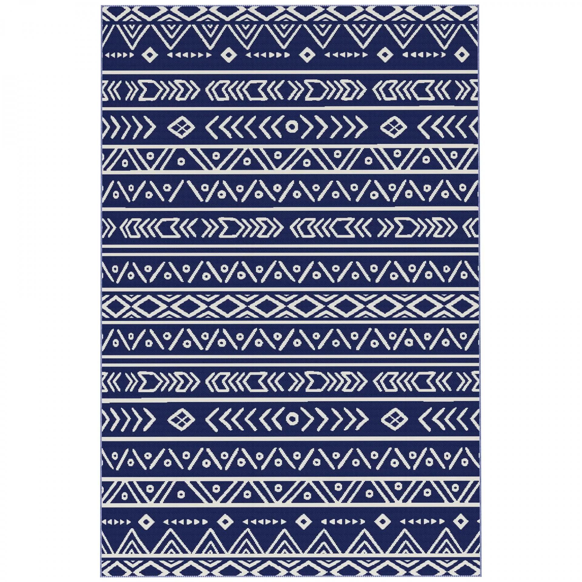 Alfombra de Exterior Reversible 182x274 cm con Patrón Geométrico de Cenefa Impermeable con Bolsa Azul y Blanco