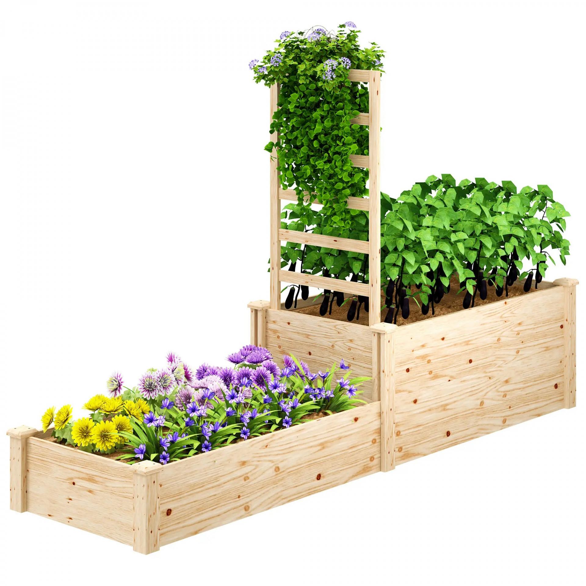 Jardinera Elevada con Celosía de Madera para Plantas Trepadoras y 2 Cajas de Cultivo 222x63x132 cm Natural