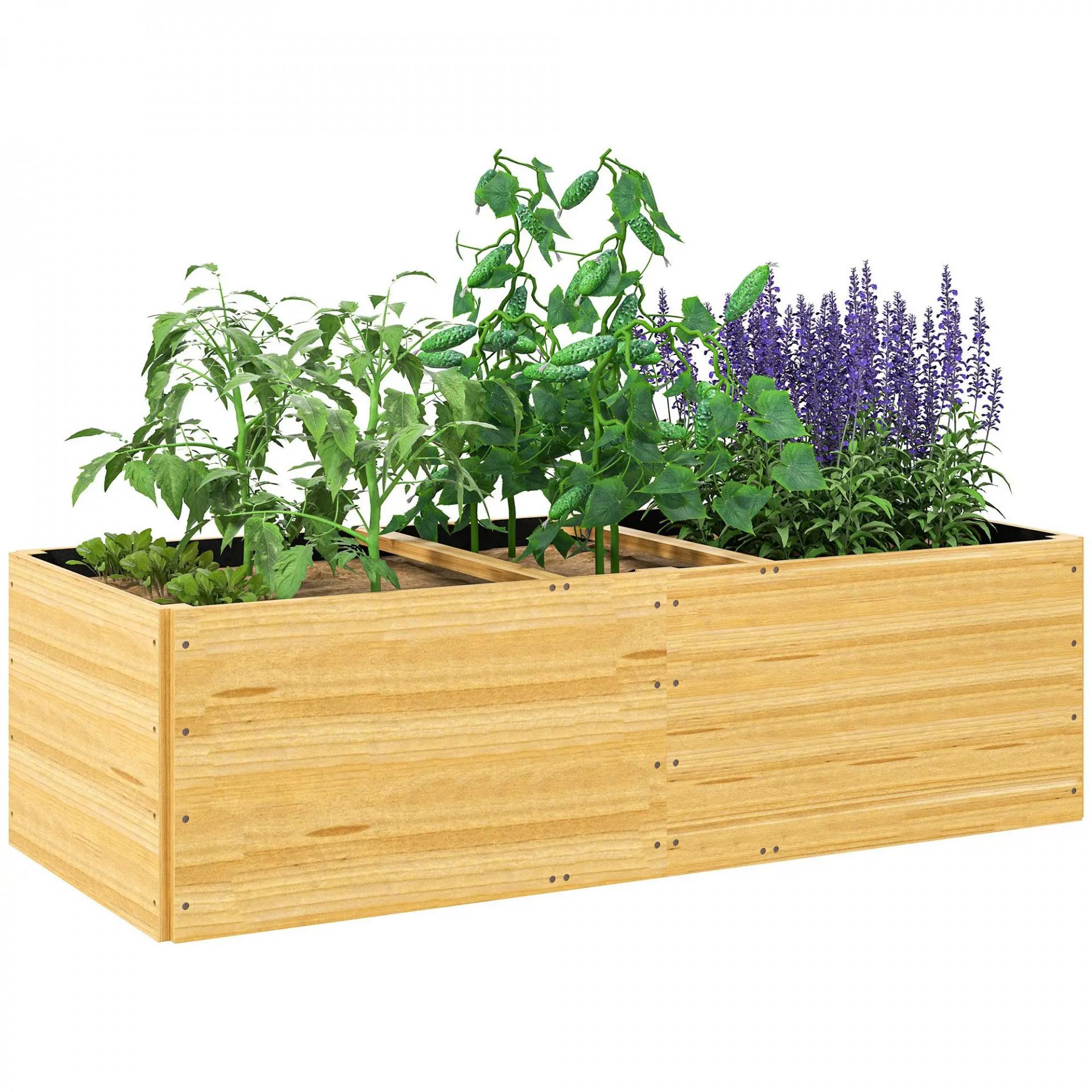 Jardinera de Madera con 3 Zonas de Cultivo y Forro Ideal para Verduras Hierbas y Flores 140x60x40cm Natural
