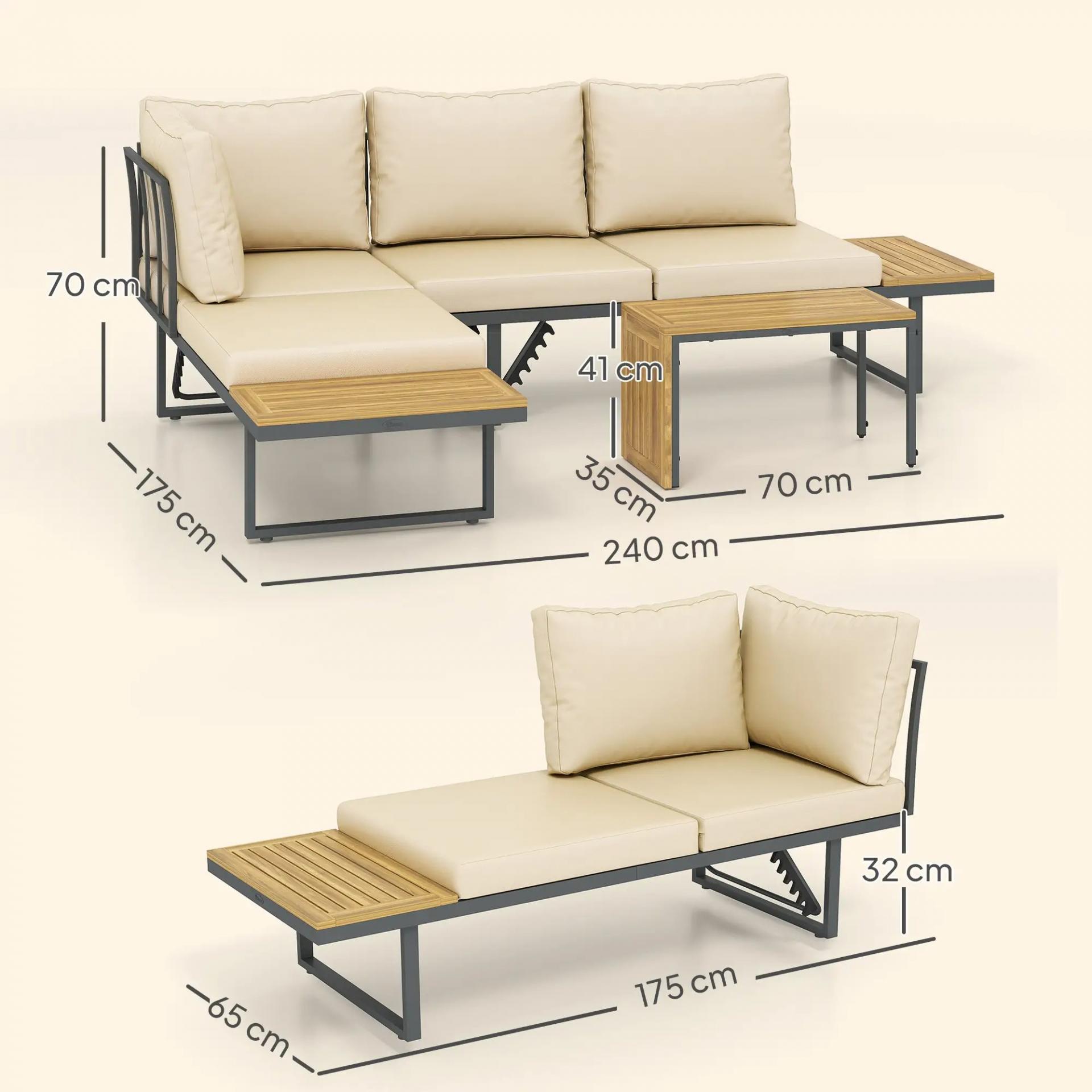 Conjunto de Sofás de Exterior Modular de Acero y Madera de Acacia con Mesa Auxiliar y Cojines Extraíbles