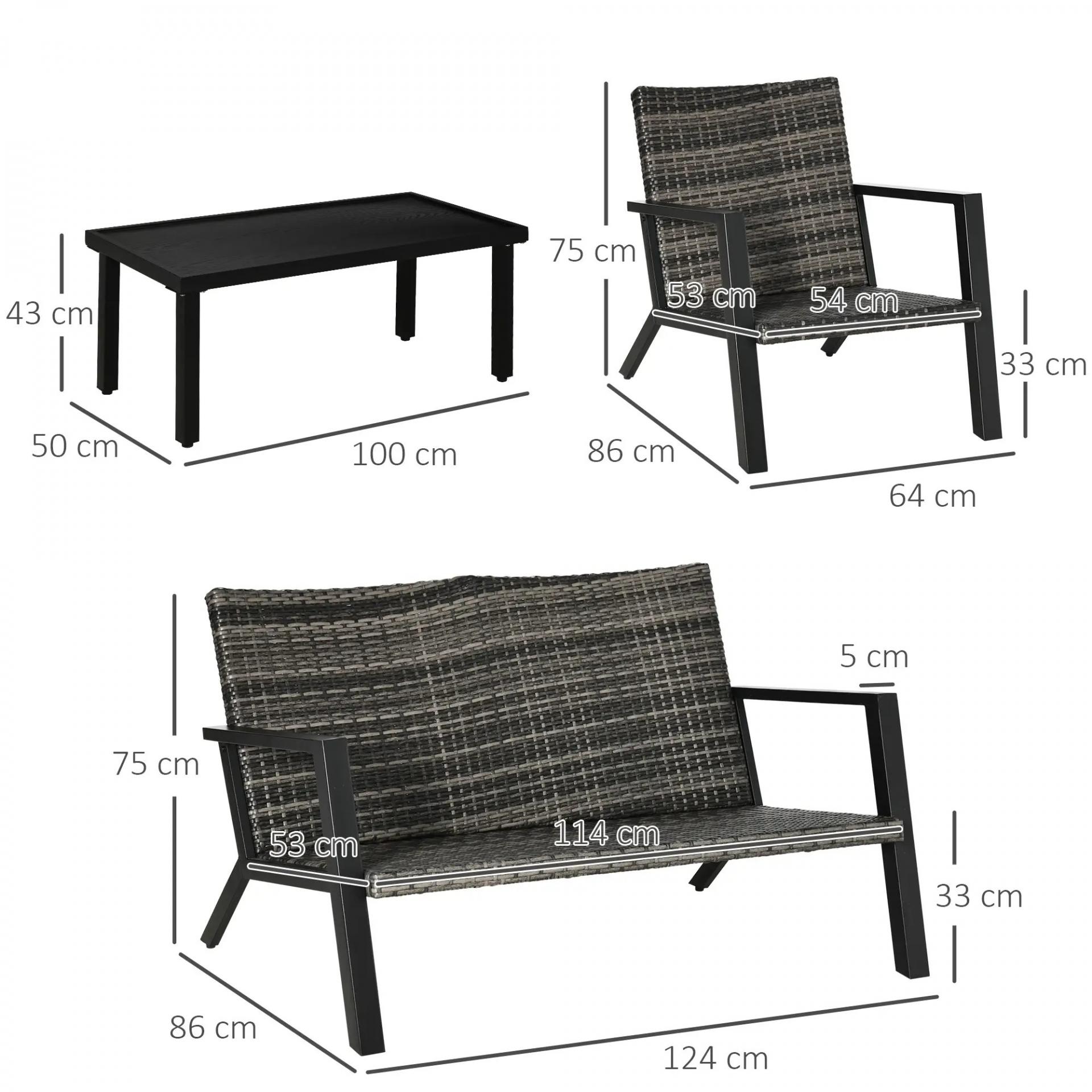 - MEDIDAS TOTALES: Medidas del sofá doble: 124x86x75 cm (LxANxAL). Medidas del sofá individual: 64x86x75 cm (LxANxAL). Medidas de la mesa de centro: 100x50x43 cm (LxANxAL). Peso máximo soportado: 320 kg (sofá doble), 160 kg (sillón individual) y 30 kg (mesa)