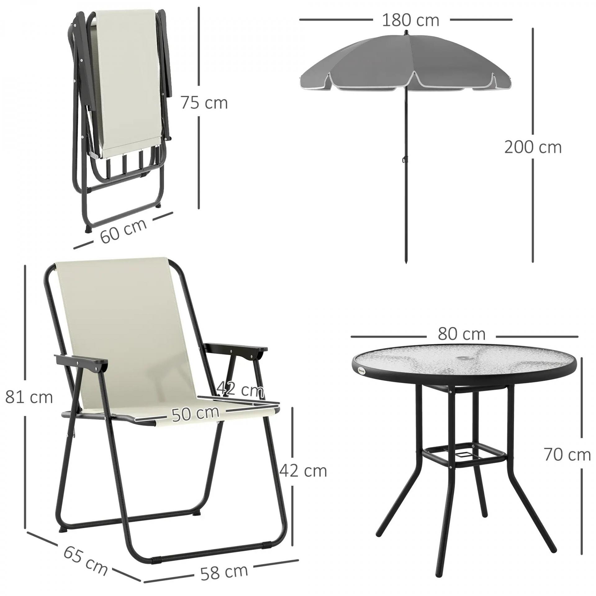 MEDIDAS TOTALES: La mesa mide Ø80x70 cm (DxAL), la sombrilla mide Ø180x200 cm (DxAL) y cada una de las sillas mide 58x65x81 cm (LxANxAL). Carga máxima: 120 kg (cada silla), 50 kg (mesa). Se requiere montaje sencillo y rápido