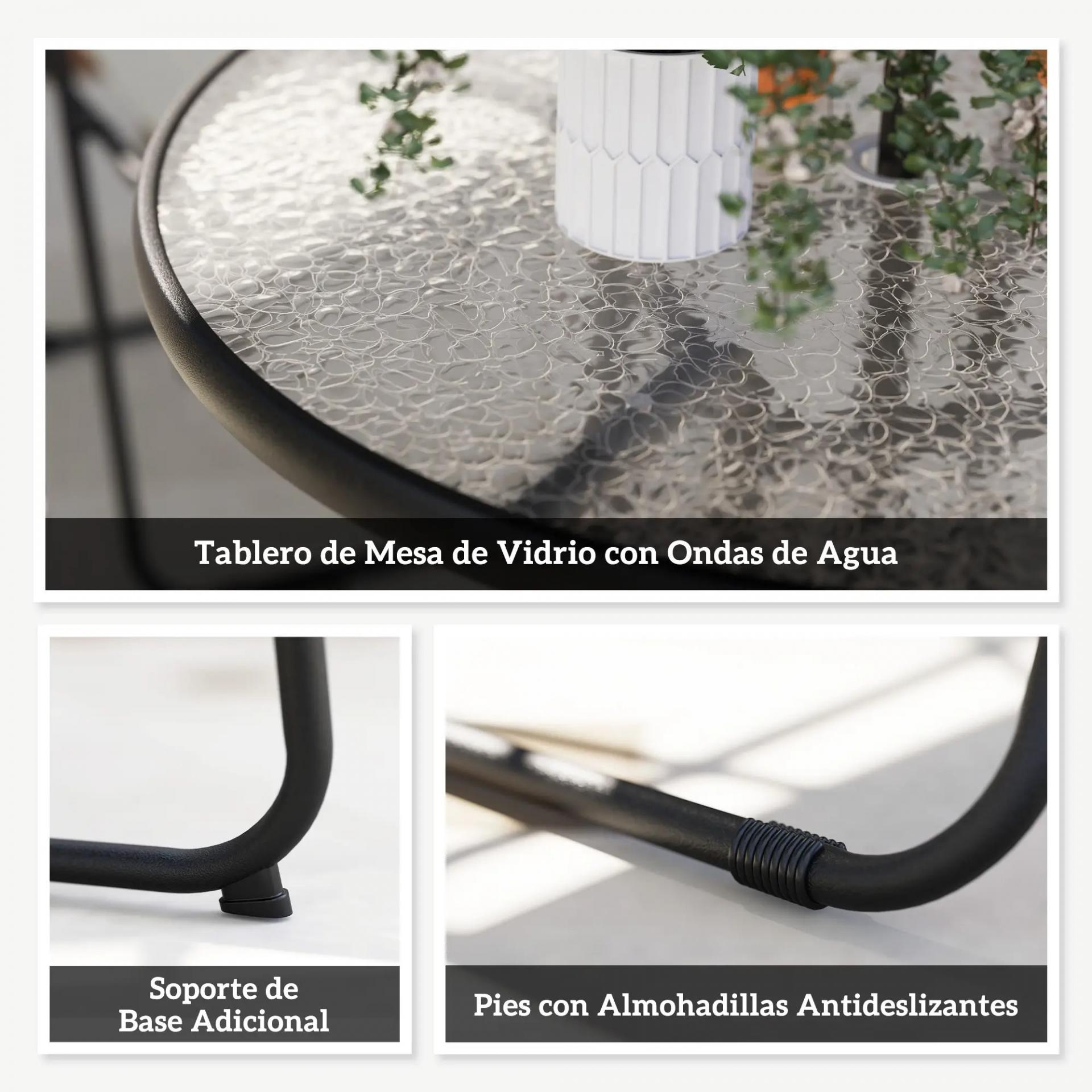 - MESA CON PARASOL DE Ø180 CM: El parasol de este conjunto de jardín exterior proporciona excelente protección solar. Se ajusta fácilmente en el orificio de Ø42 mm de la mesa y cuenta con un elegante tope de vidrio ondulado para mayor estabilidad