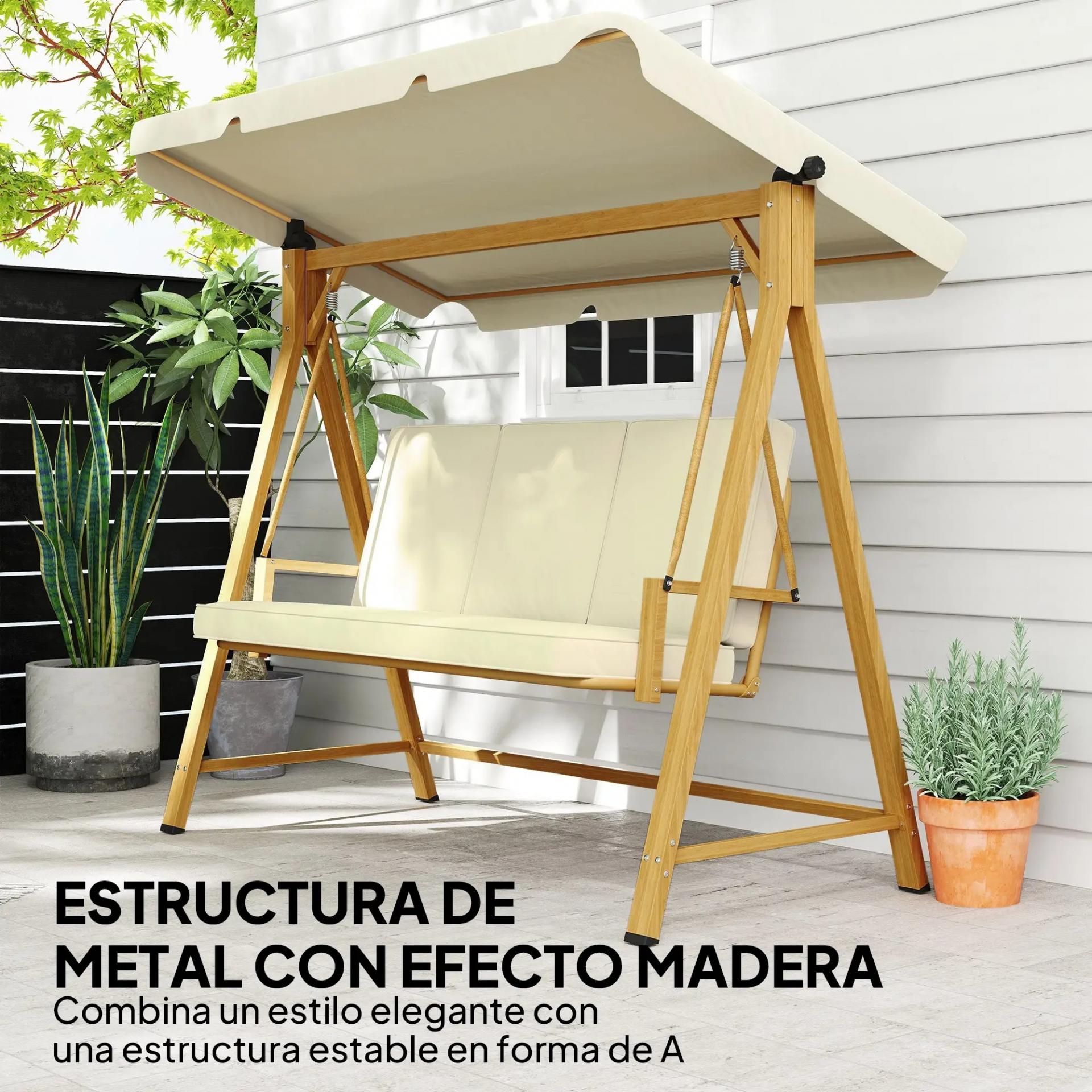 - DURABILIDAD Y ESTILO: Con estructura metálica con efecto madera, este columpio de jardín exterior combina elegancia y resistencia, siendo ideal para uso prolongado en el jardín o la terraza, soportando diversas condiciones climáticas